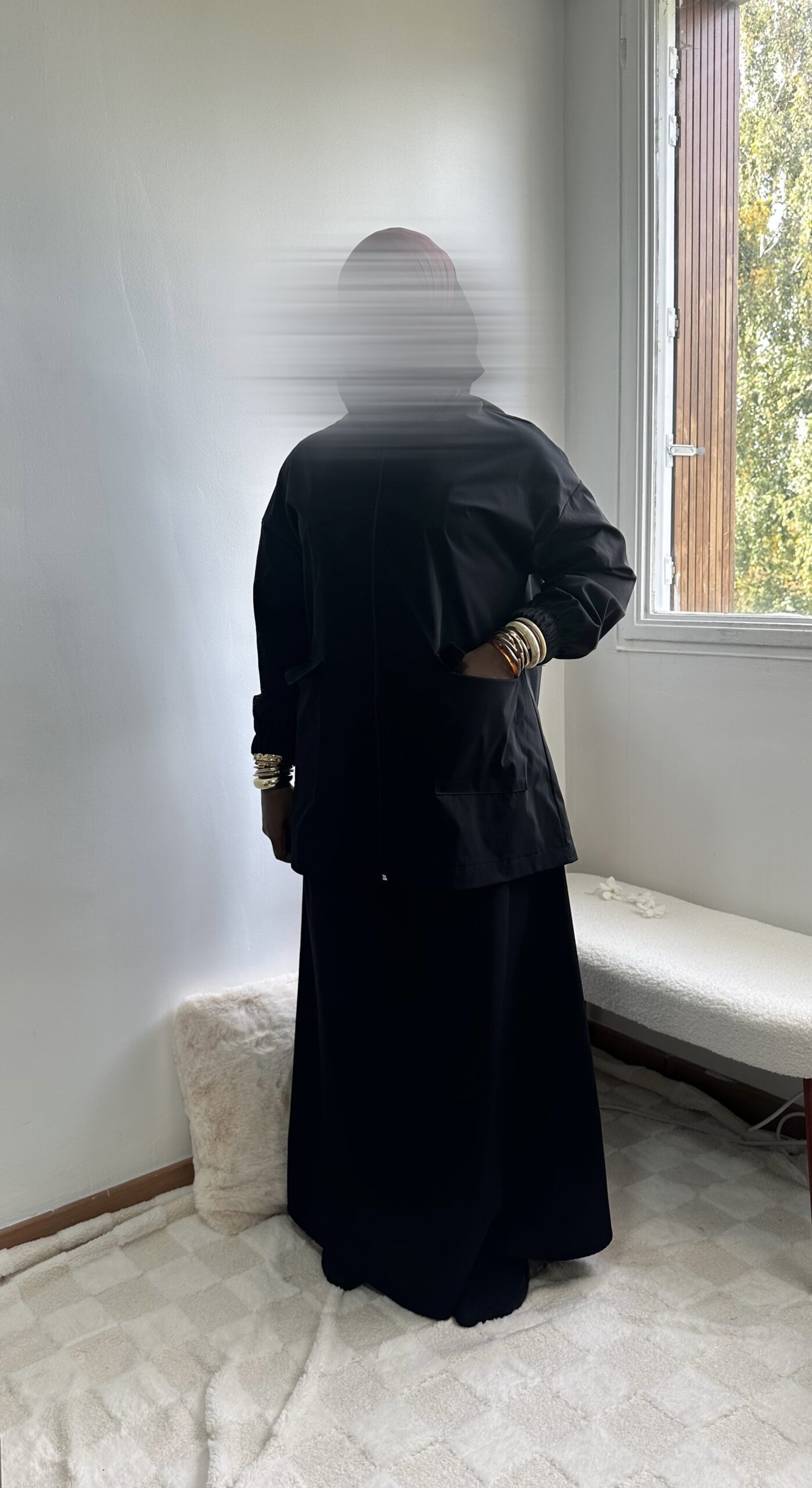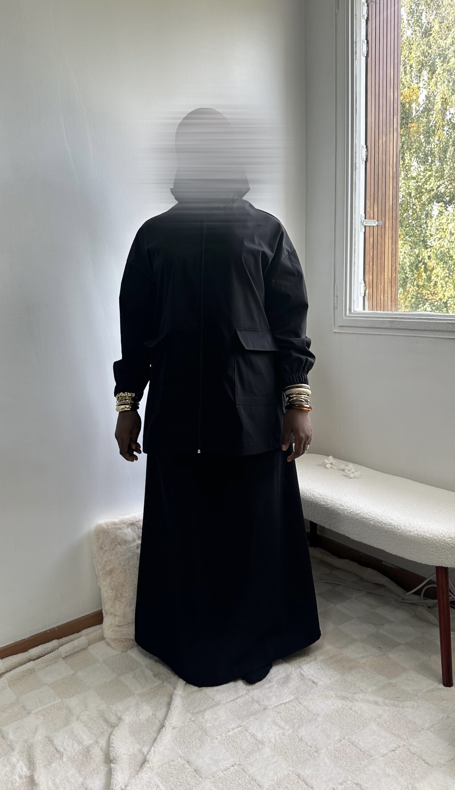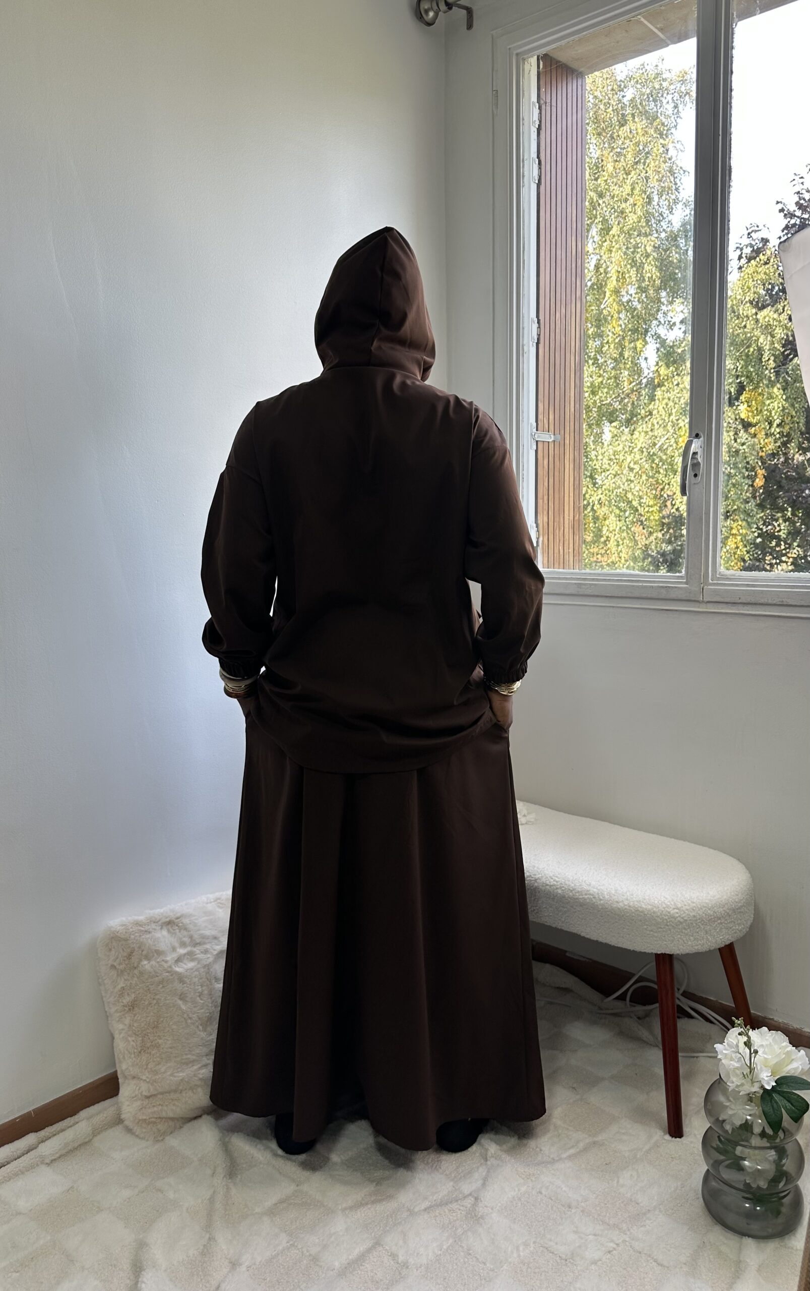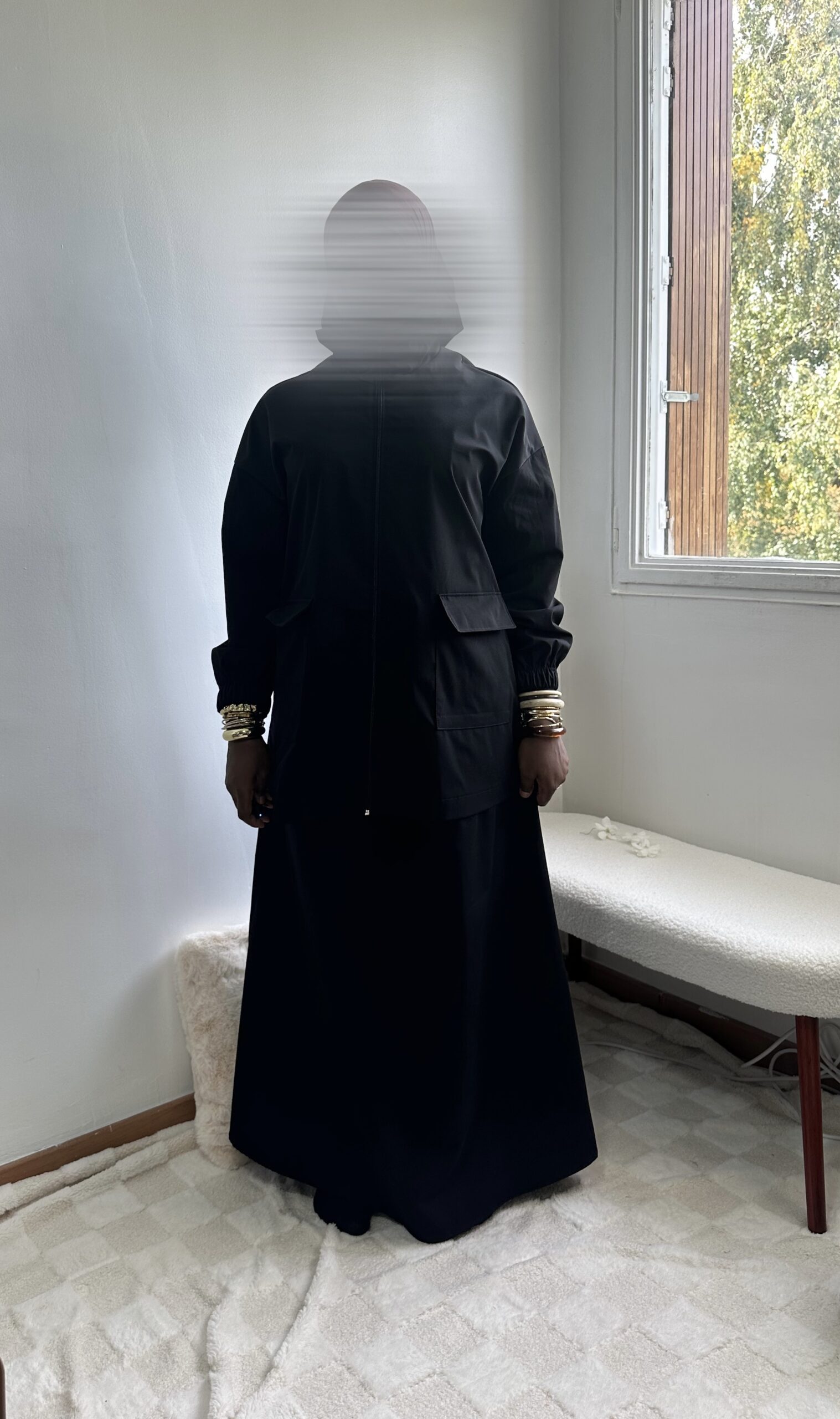 - Haut : coupe ample avec poches à rabat + capuche intégrée