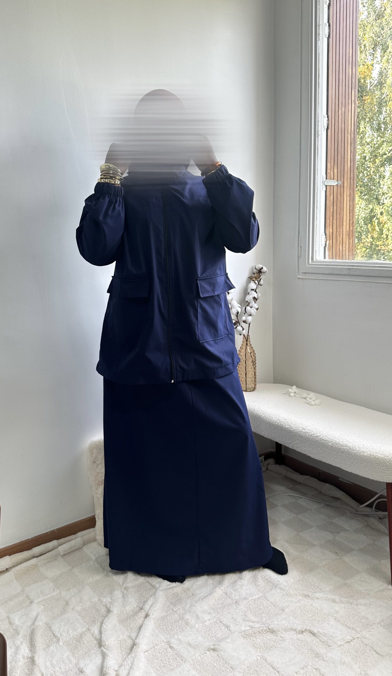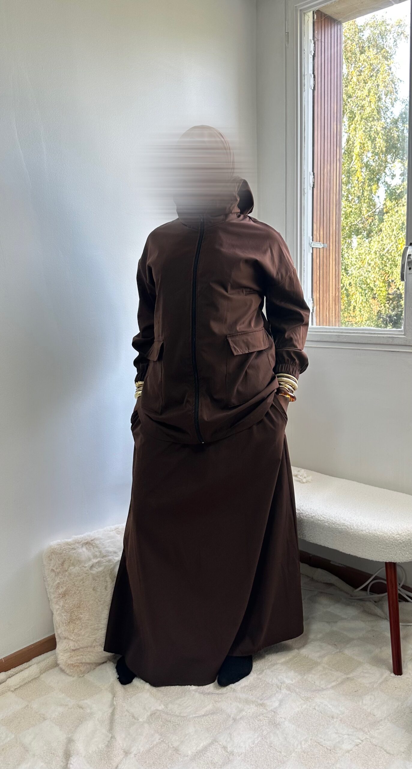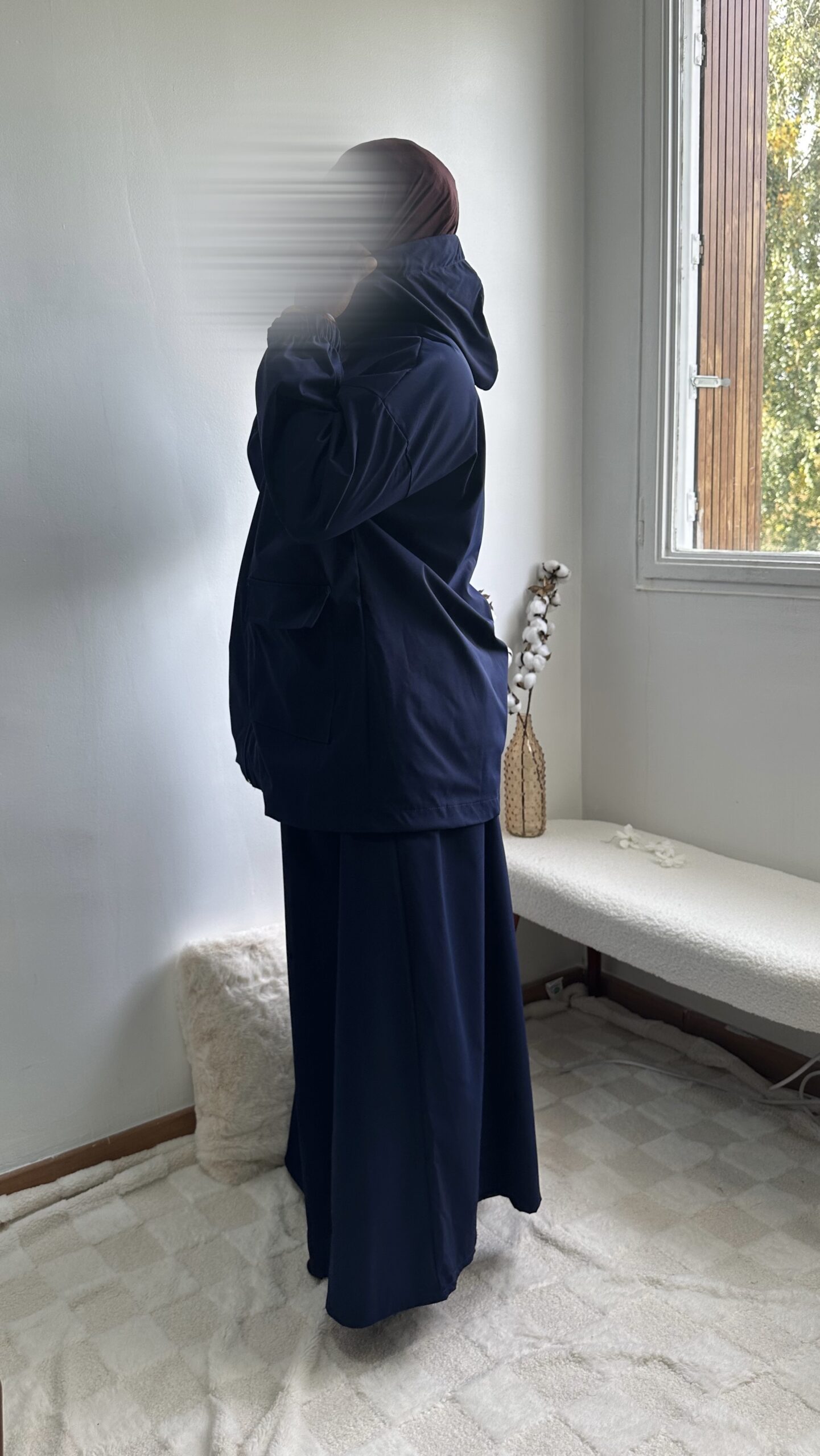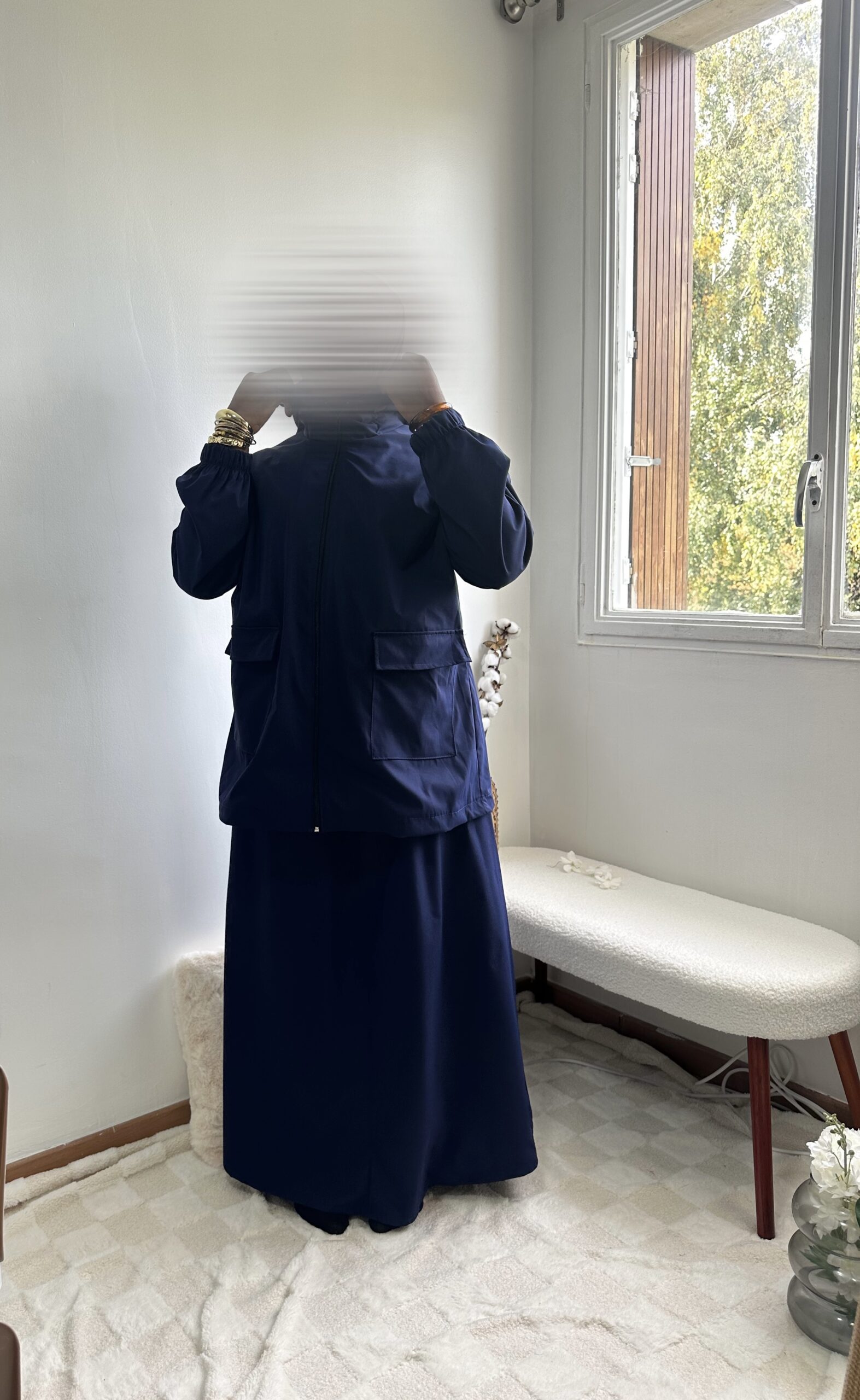 - Haut : coupe ample avec poches à rabat + capuche intégrée