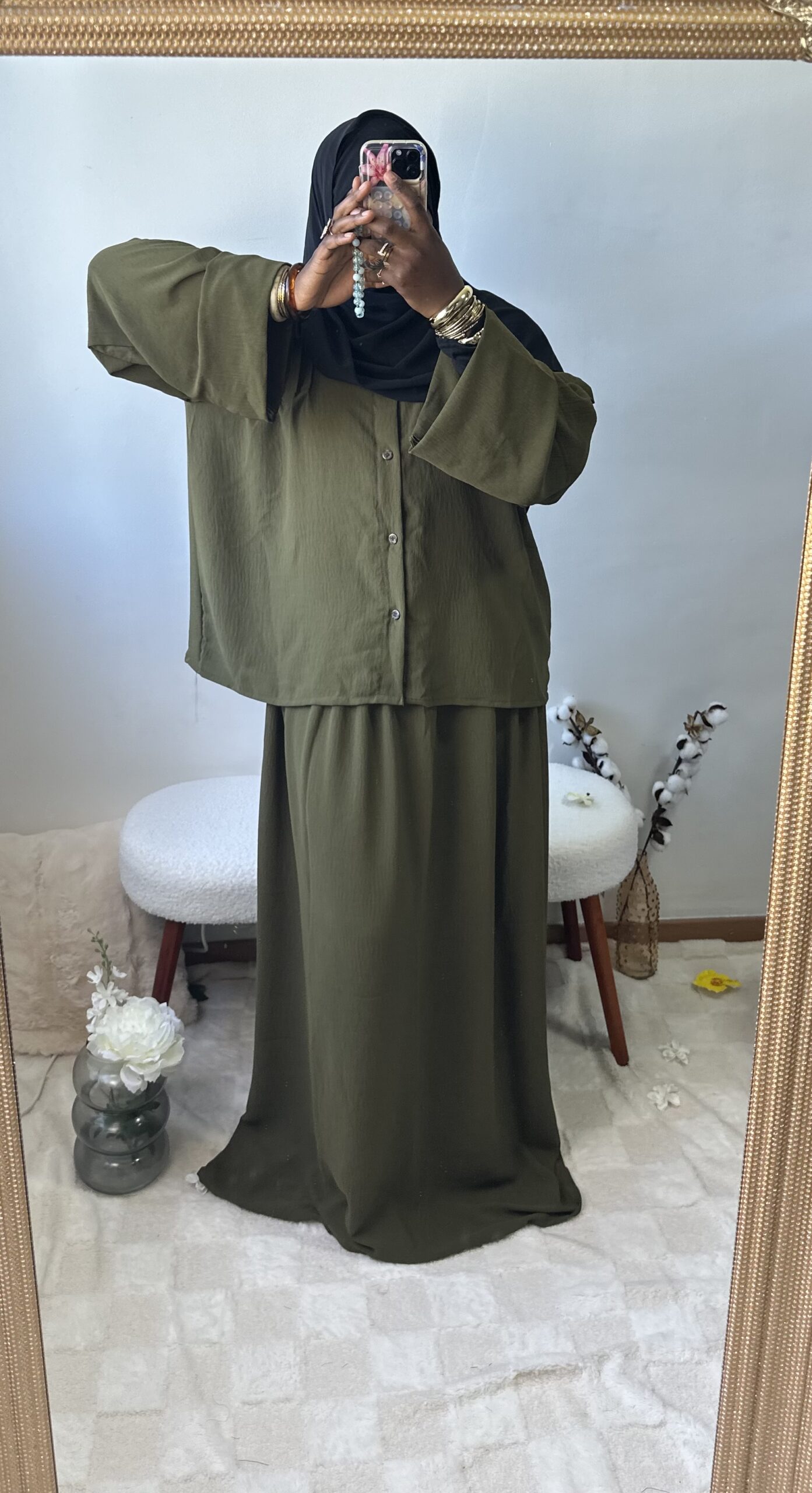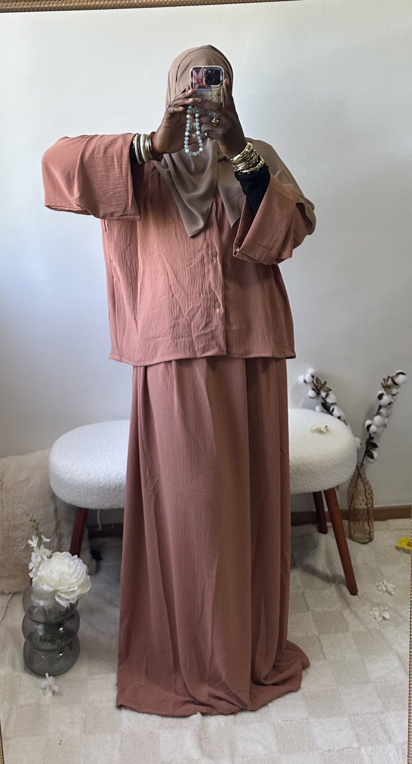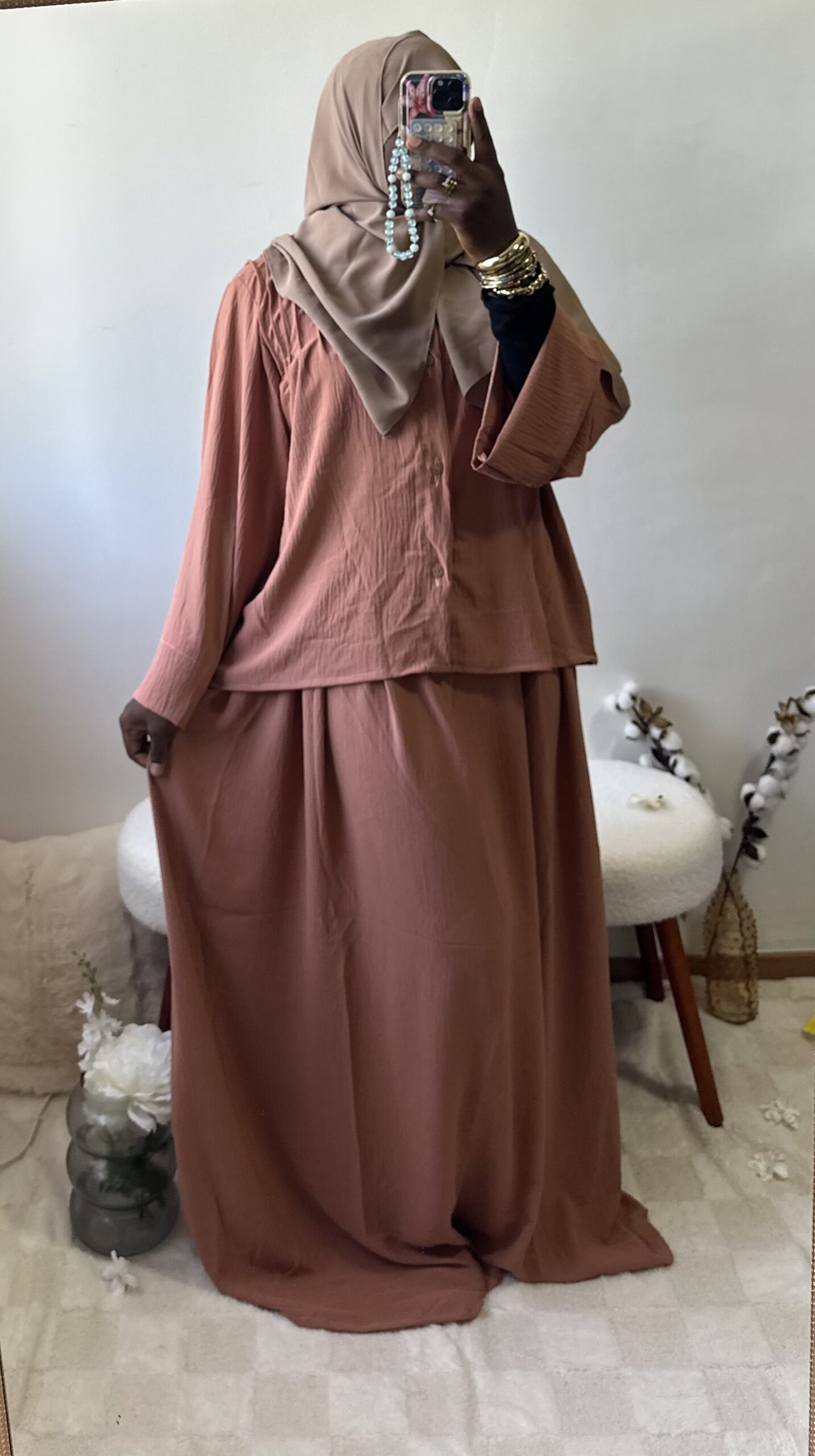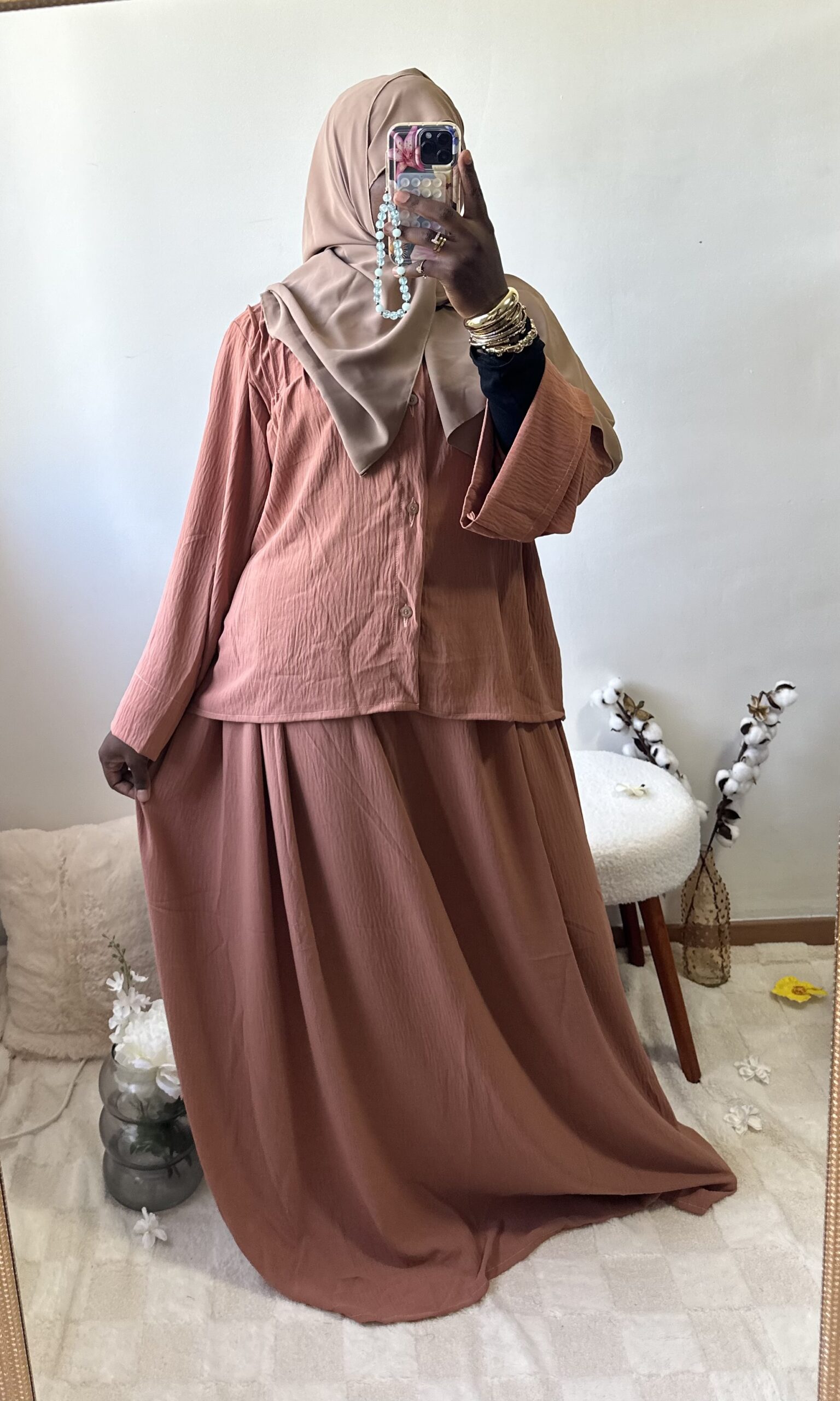 Sobre et raffiné, cet ensemble 2 pièces se compose d’une jupe fluide et d’un haut chic aux détails soignés sur la poitrine et le dos. Une tenue ample et confortable qui allie simplicité et élégance intemporelle.