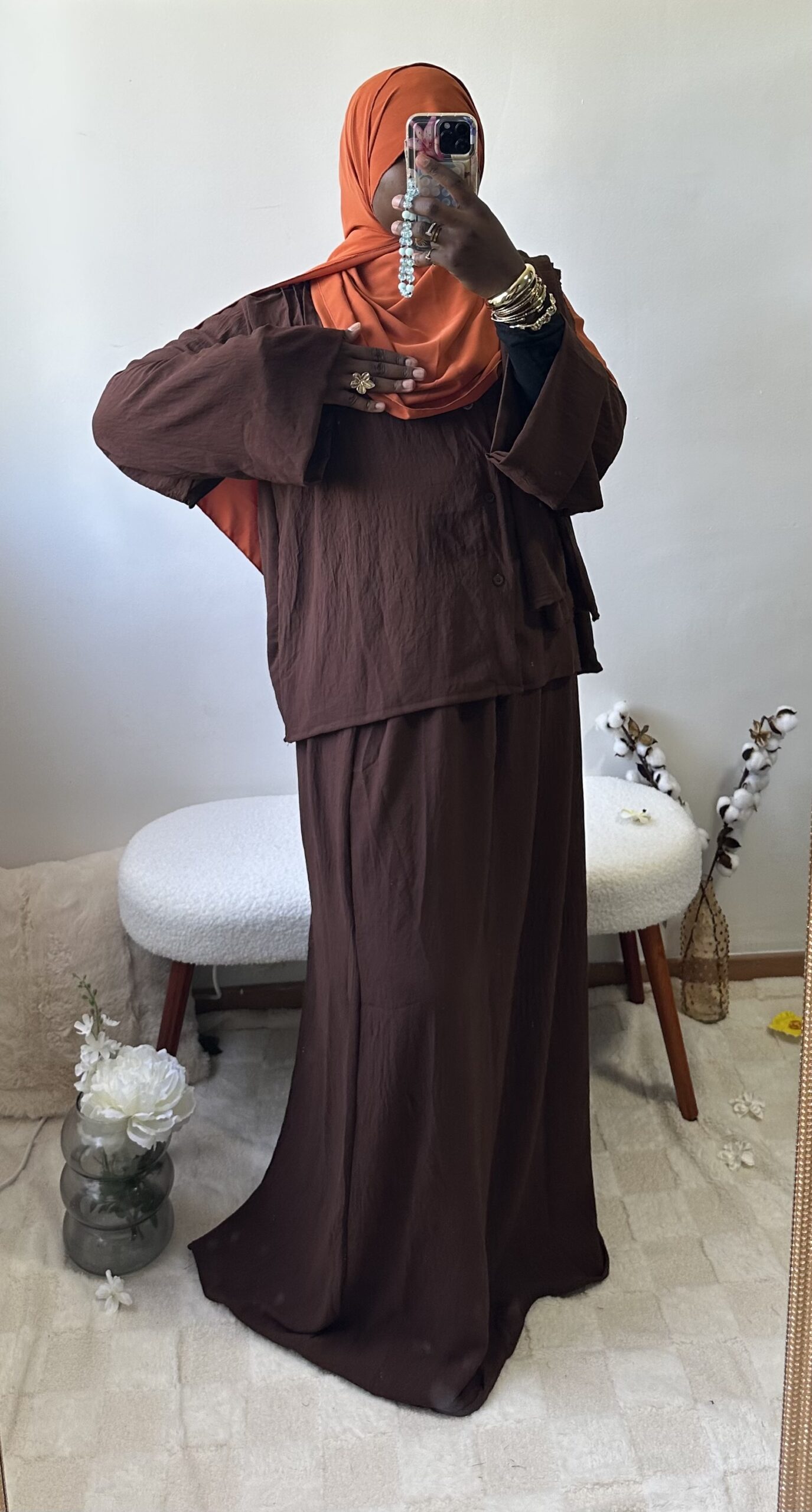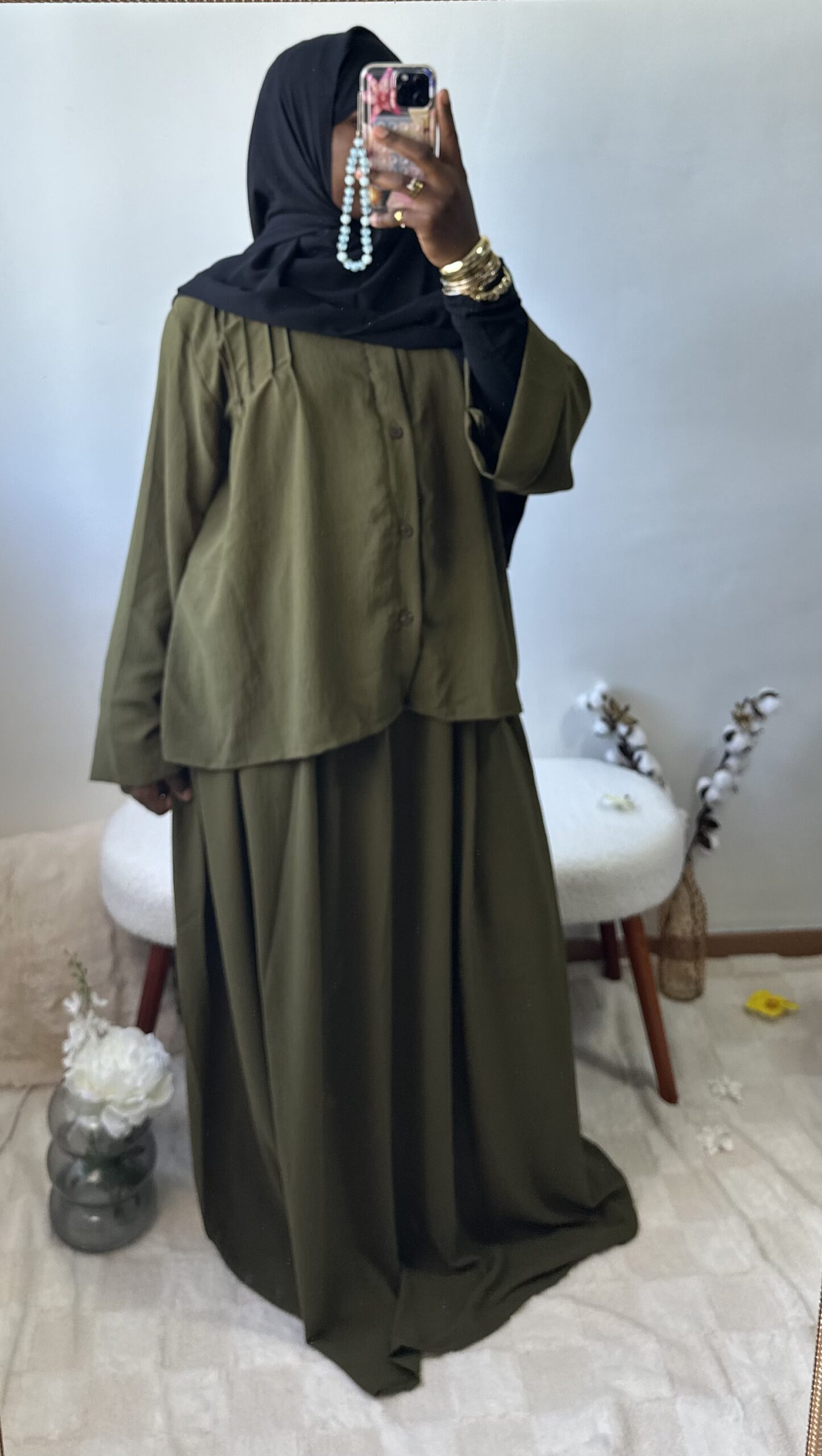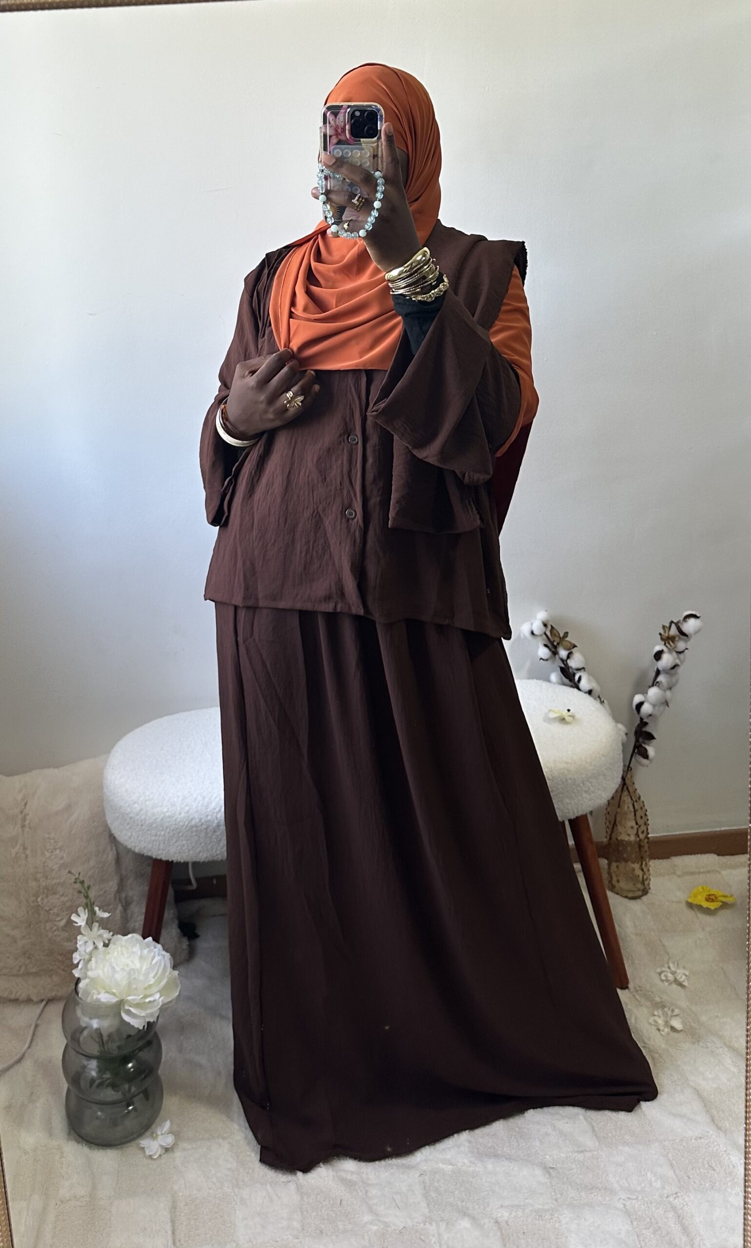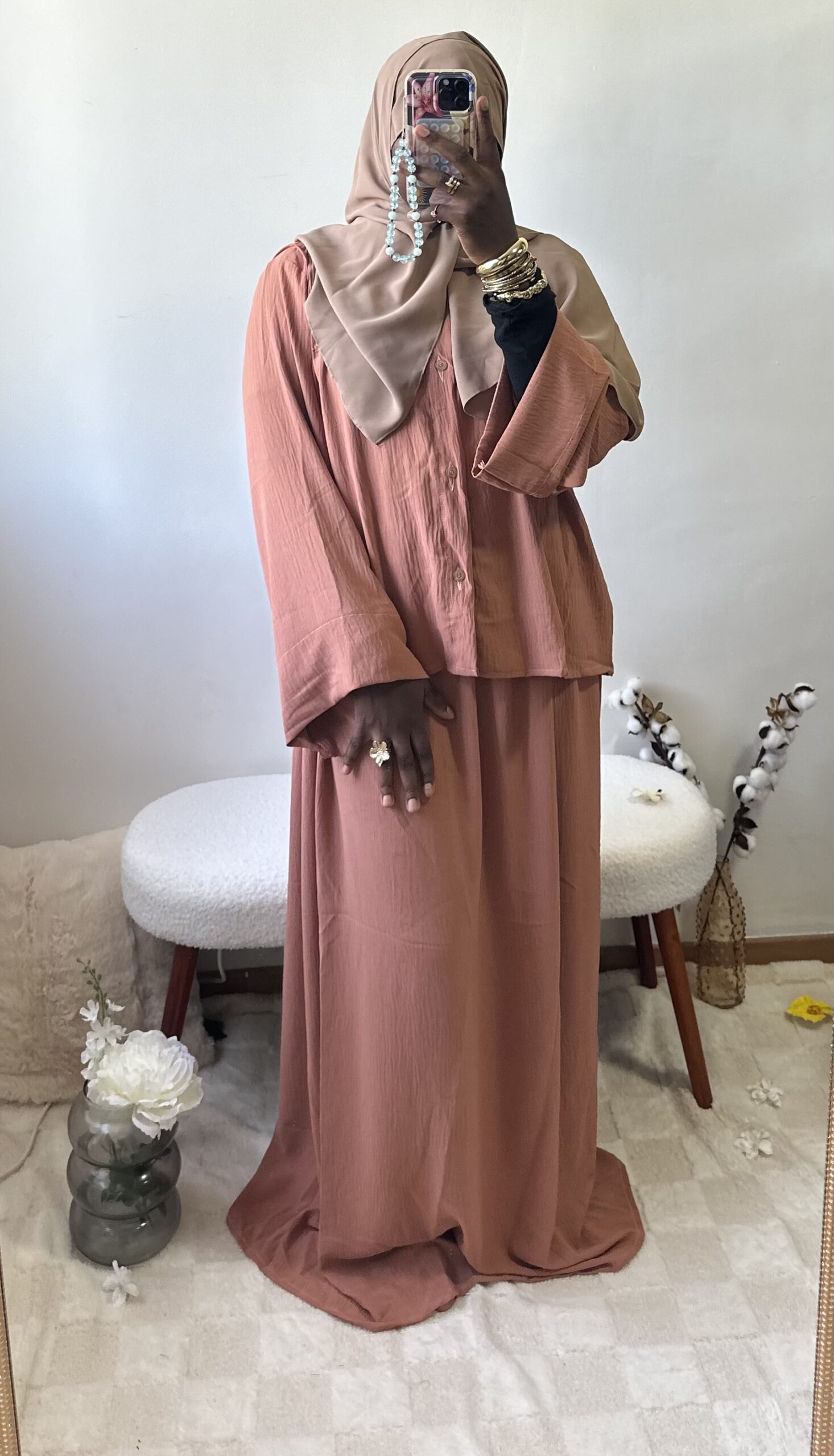 Sobre et raffiné, cet ensemble 2 pièces se compose d’une jupe fluide et d’un haut chic aux détails soignés sur la poitrine et le dos. Une tenue ample et confortable qui allie simplicité et élégance intemporelle.