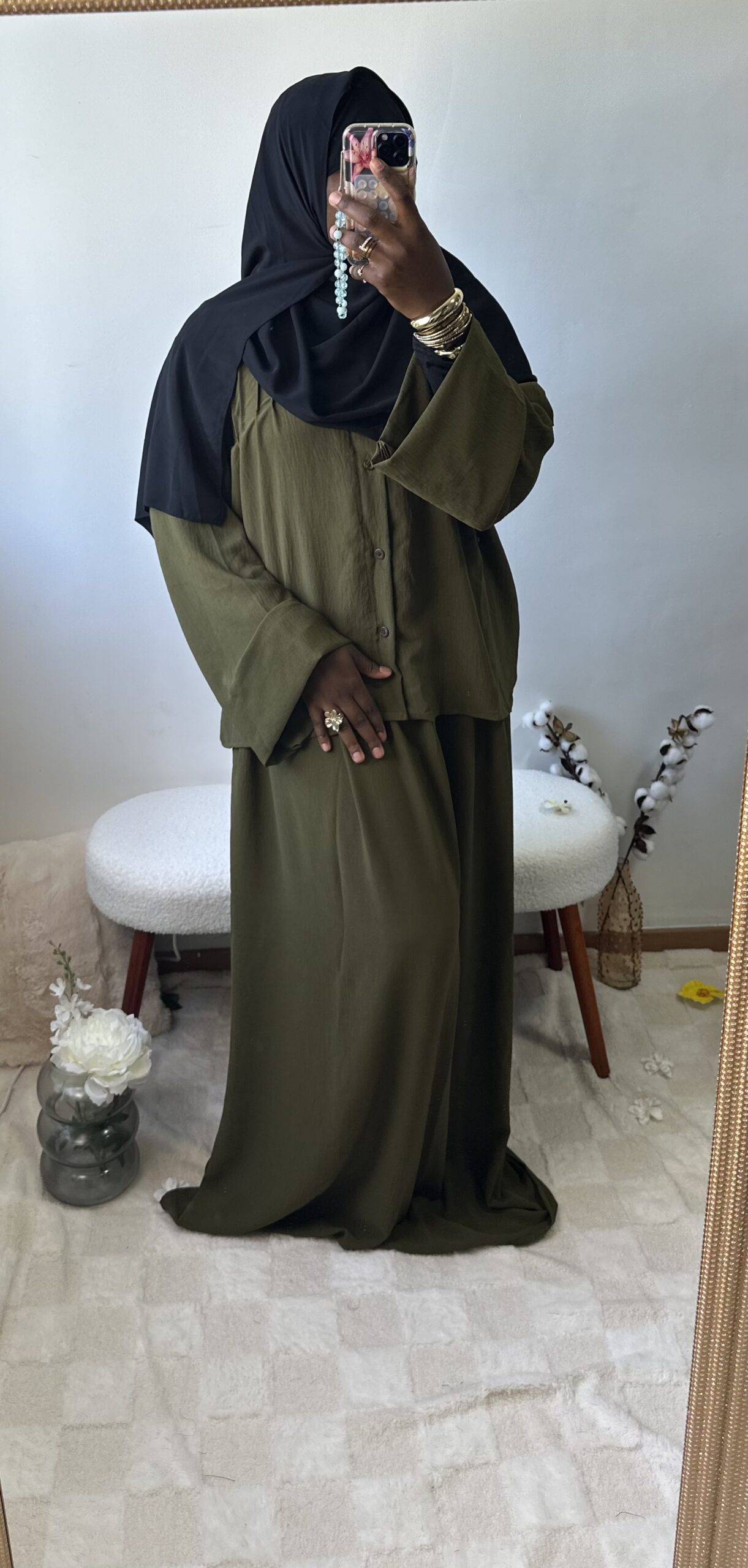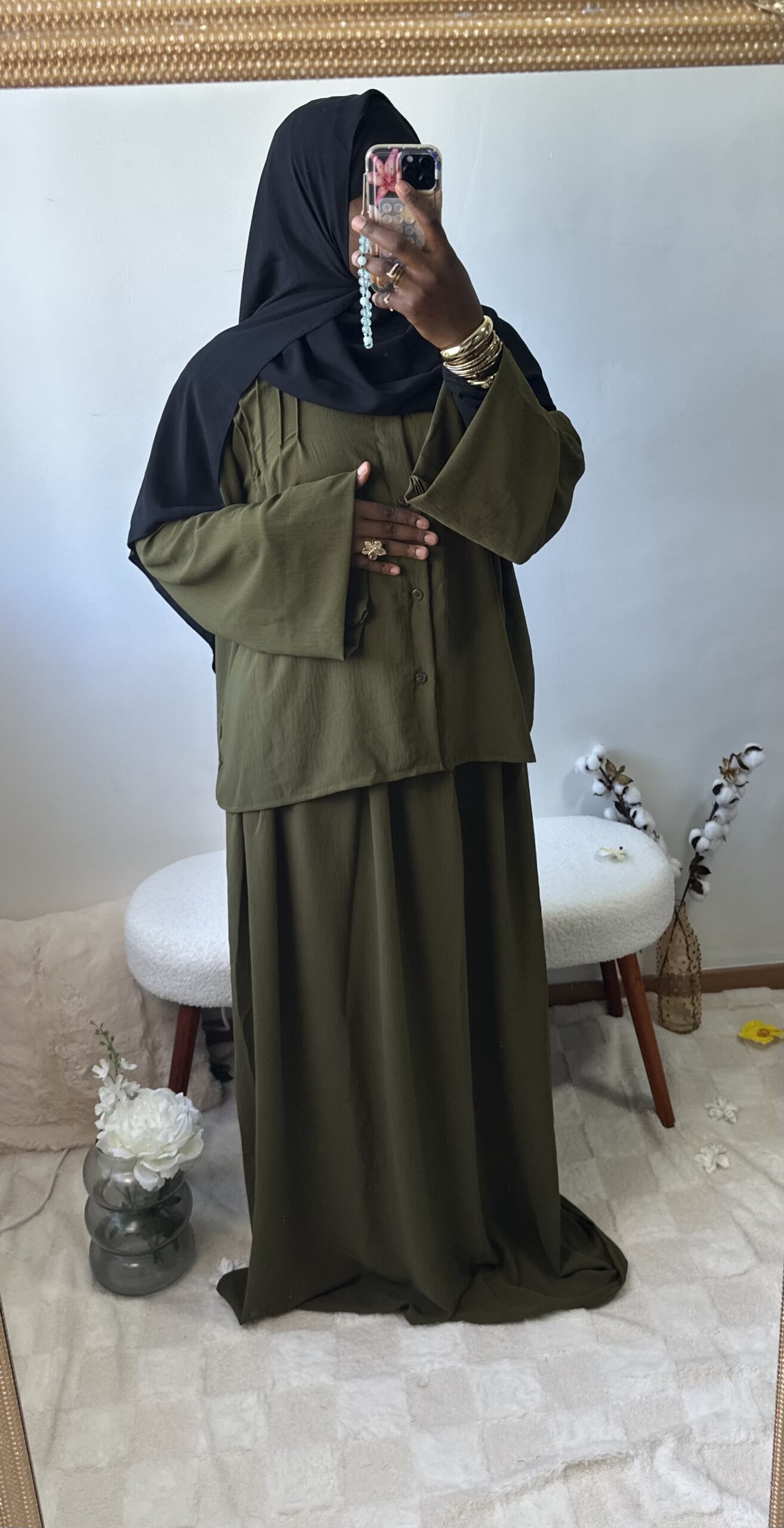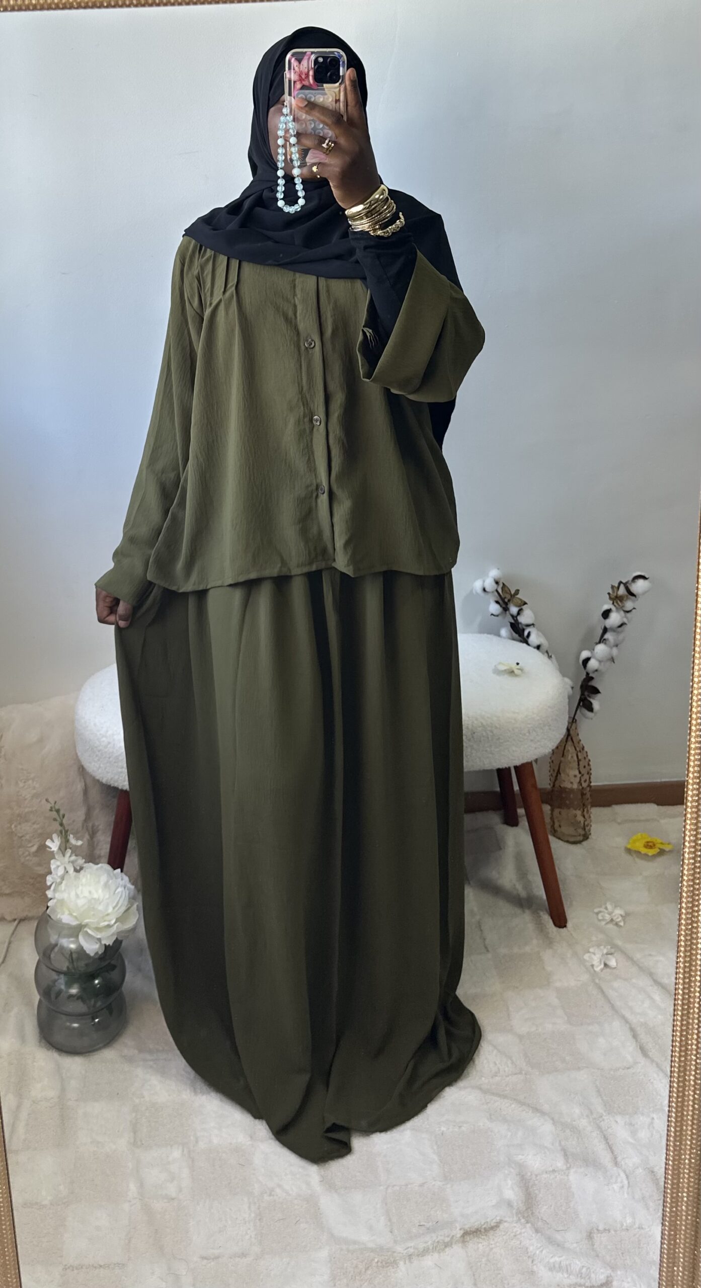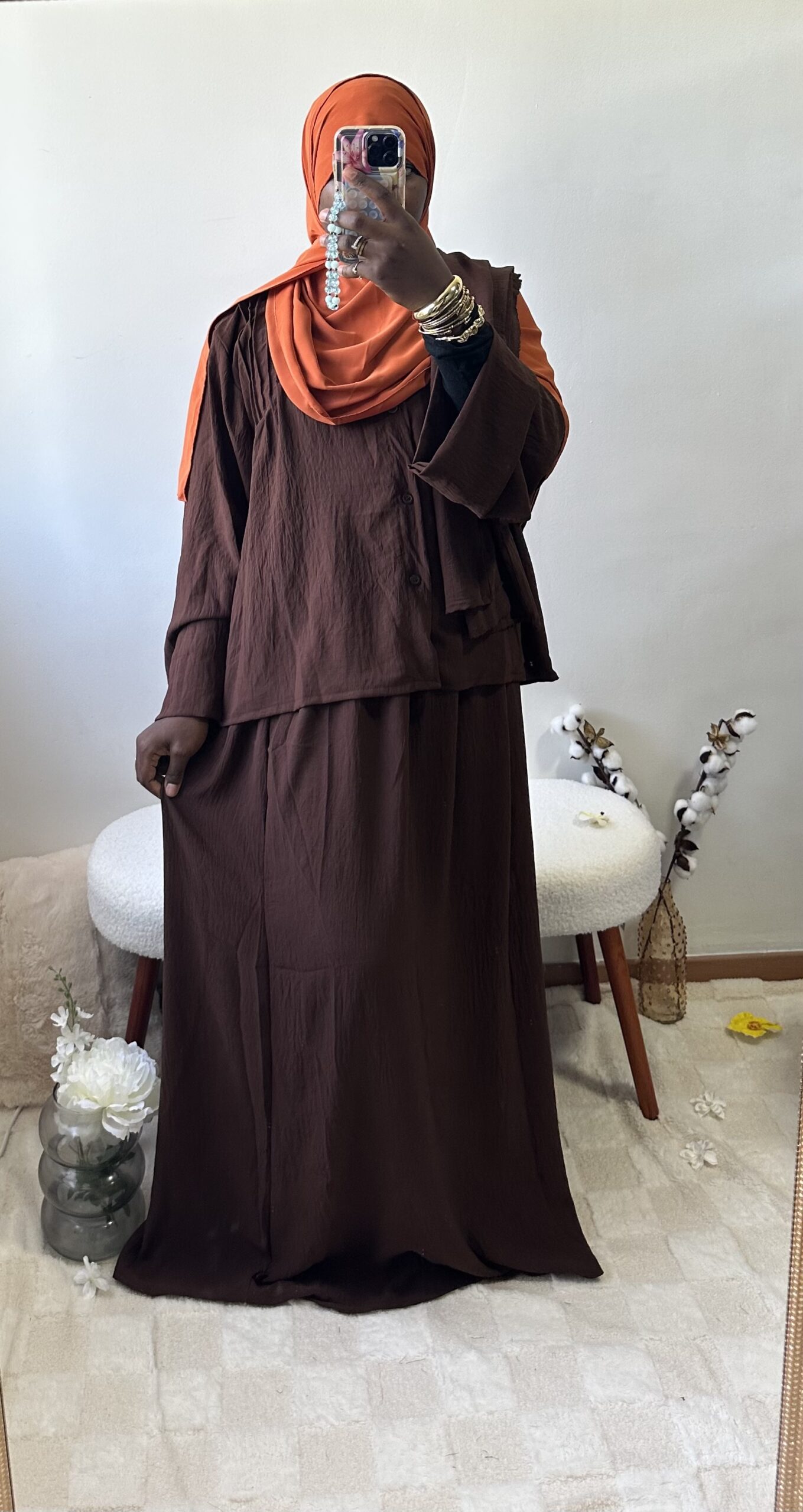 Sobre et raffiné, cet ensemble 2 pièces se compose d’une jupe fluide et d’un haut chic aux détails soignés sur la poitrine et le dos. Une tenue ample et confortable qui allie simplicité et élégance intemporelle.