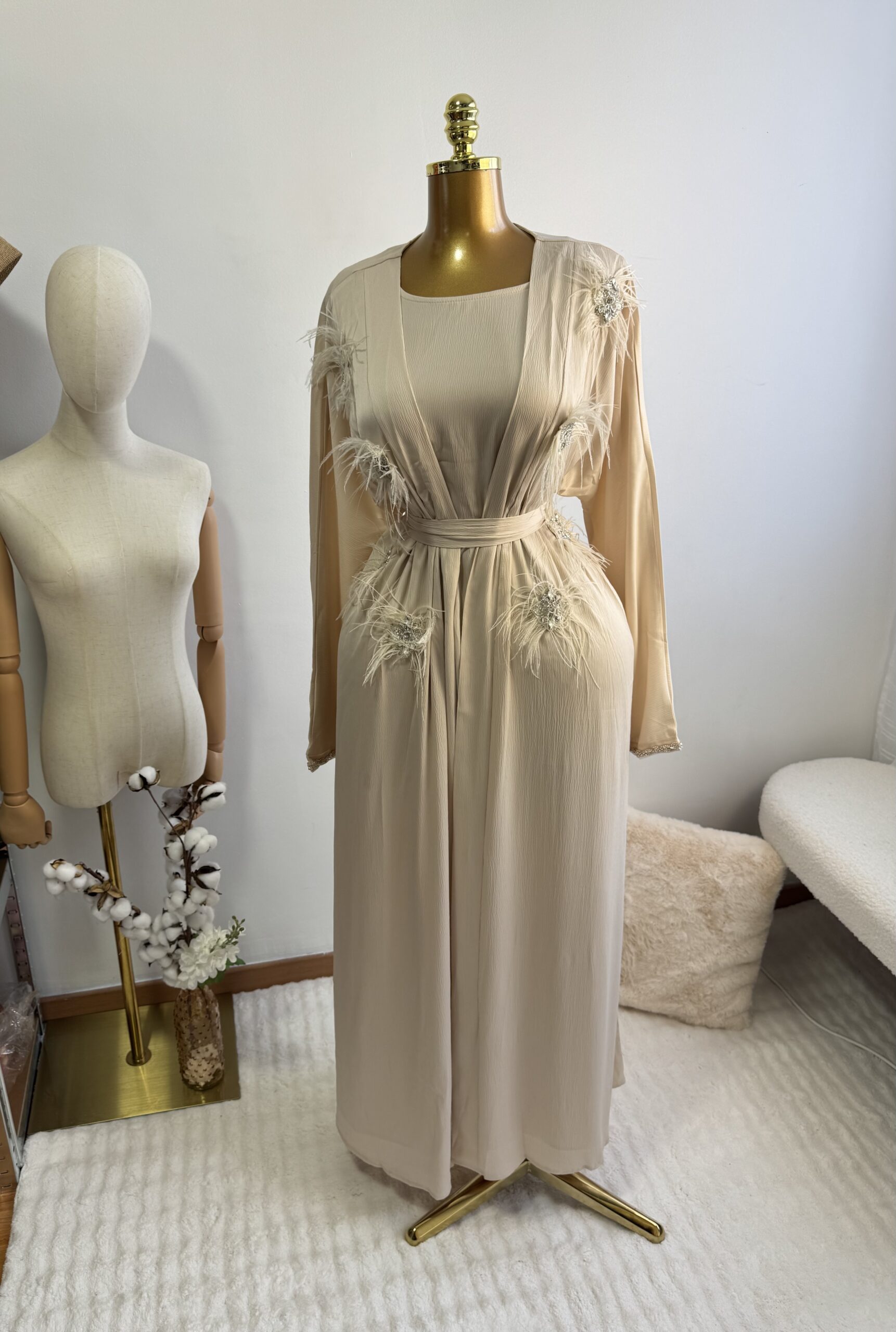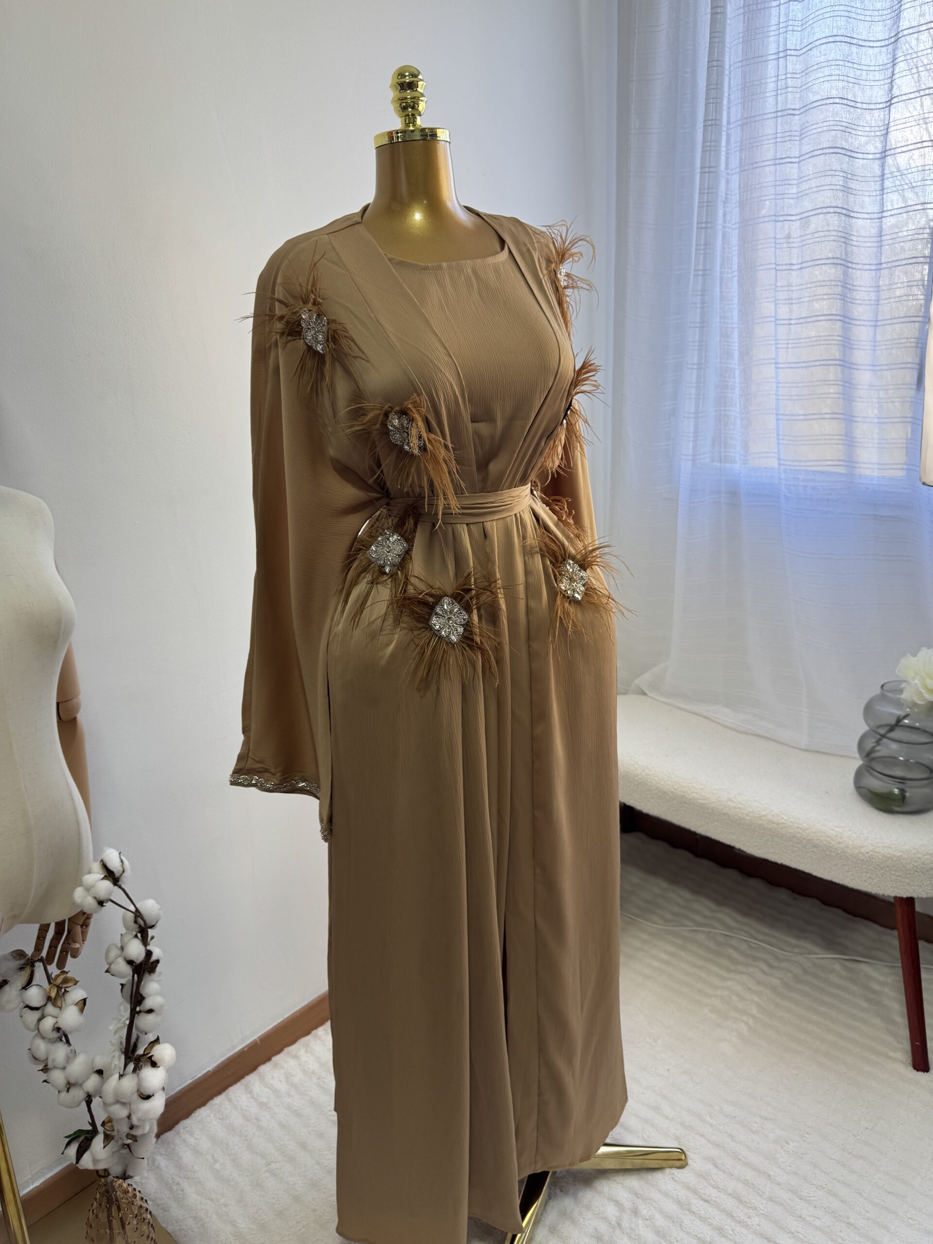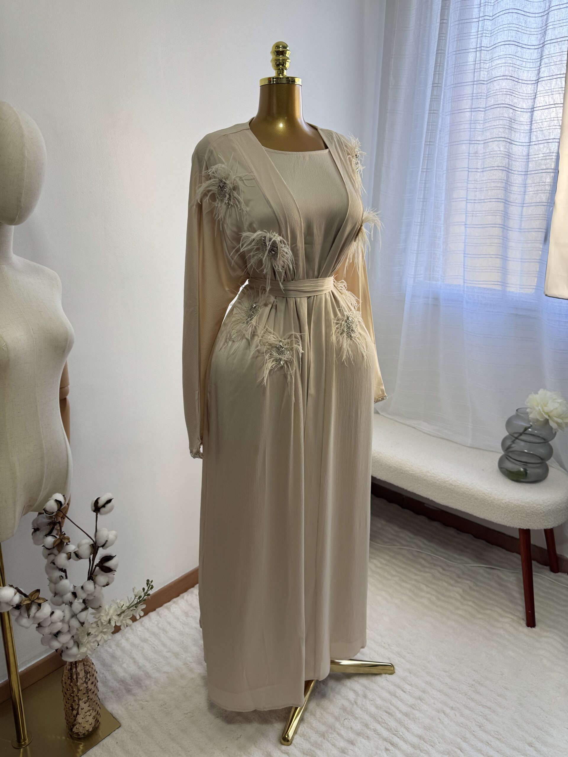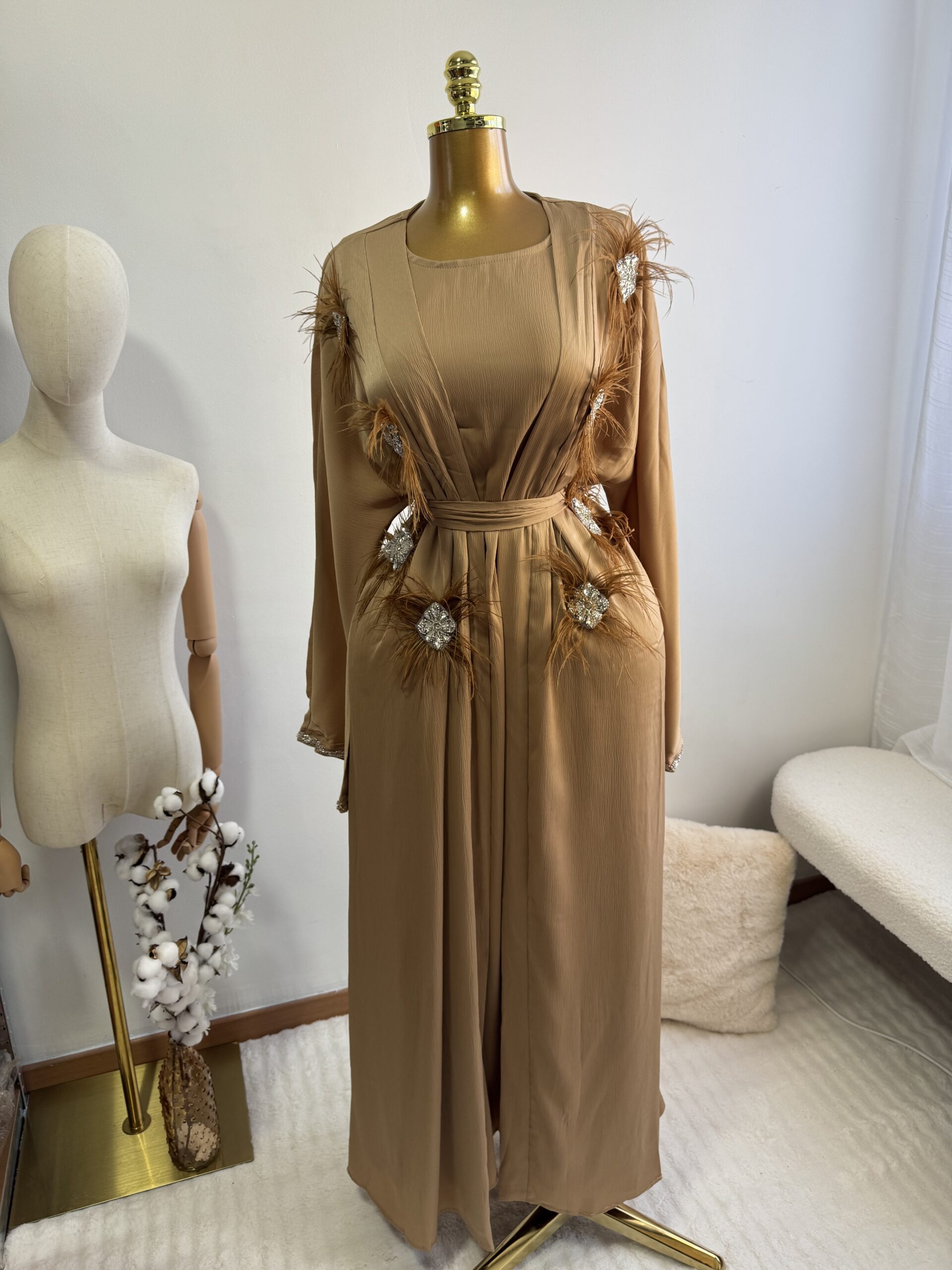 Un ensemble trois pièces très original composé d’une sous Abaya/robe, un magnifique kimono brodé de plumes et perles ainsi que de sa ceinture que vous pouvez attacher à l’abaya ou le kimono selon votre préférence.