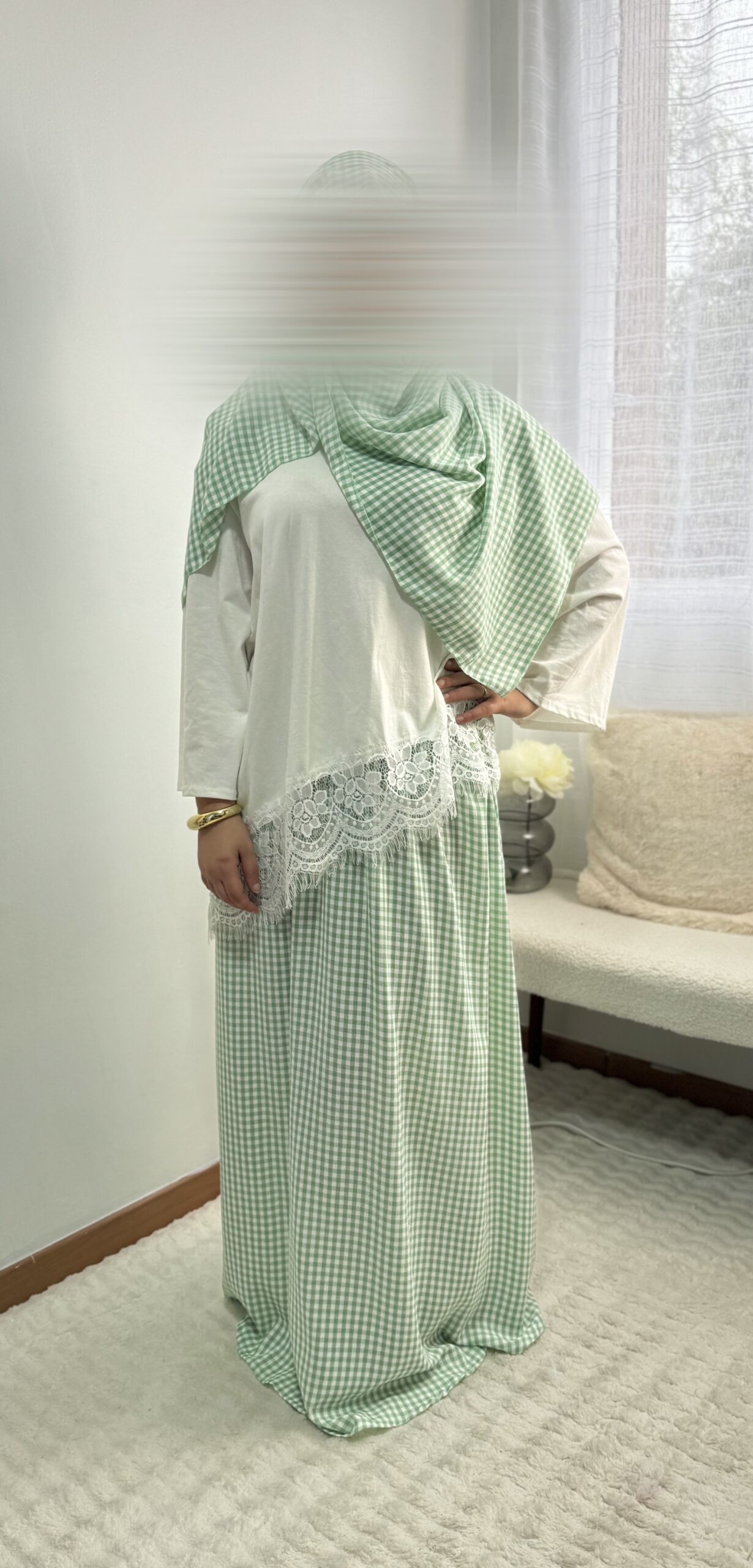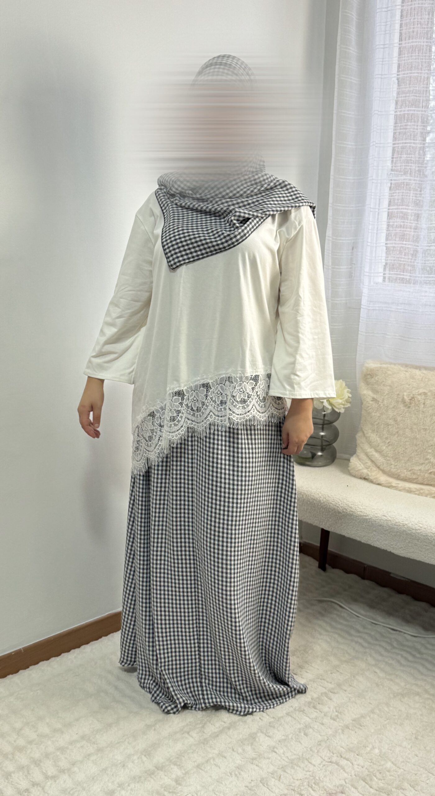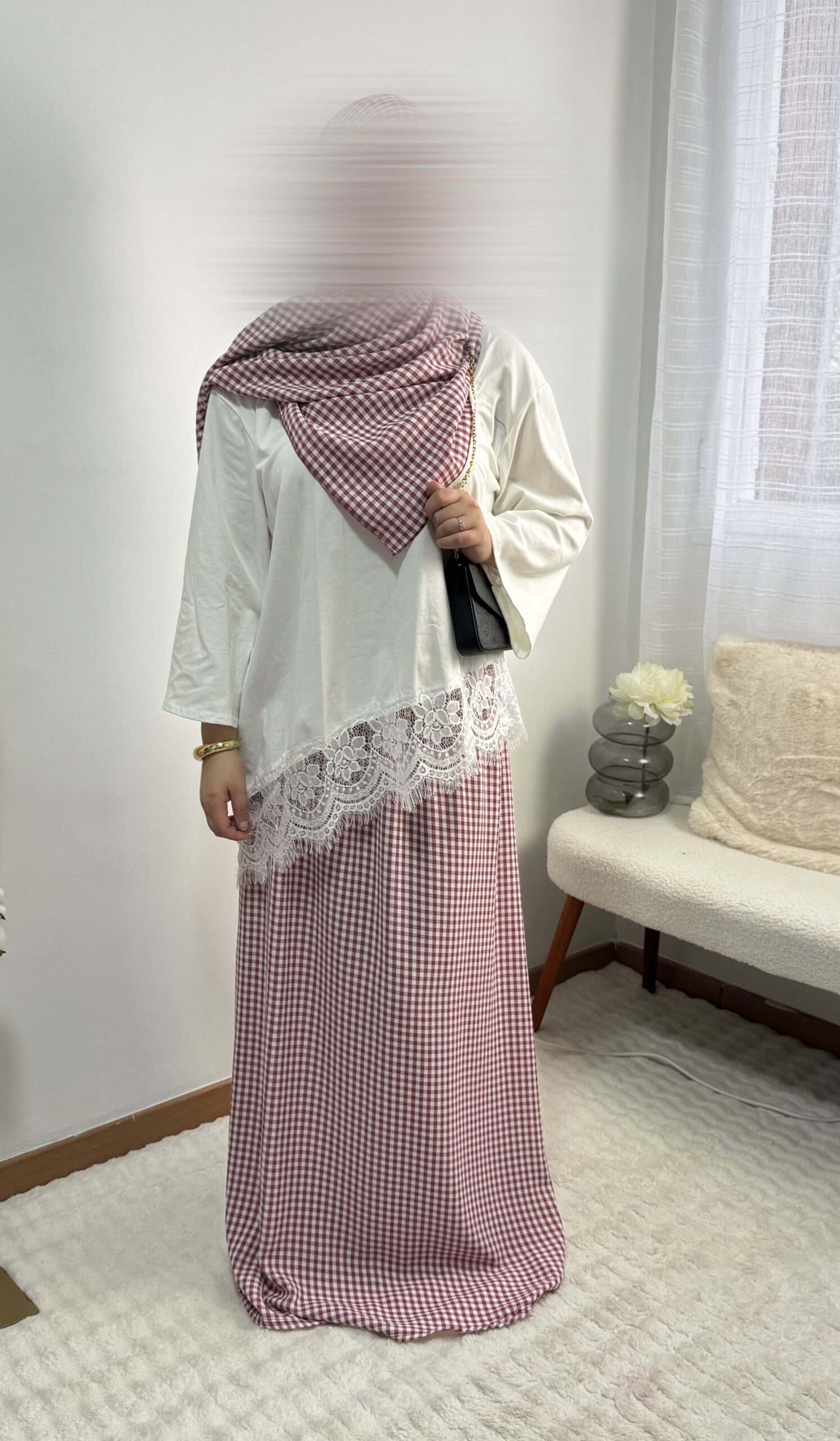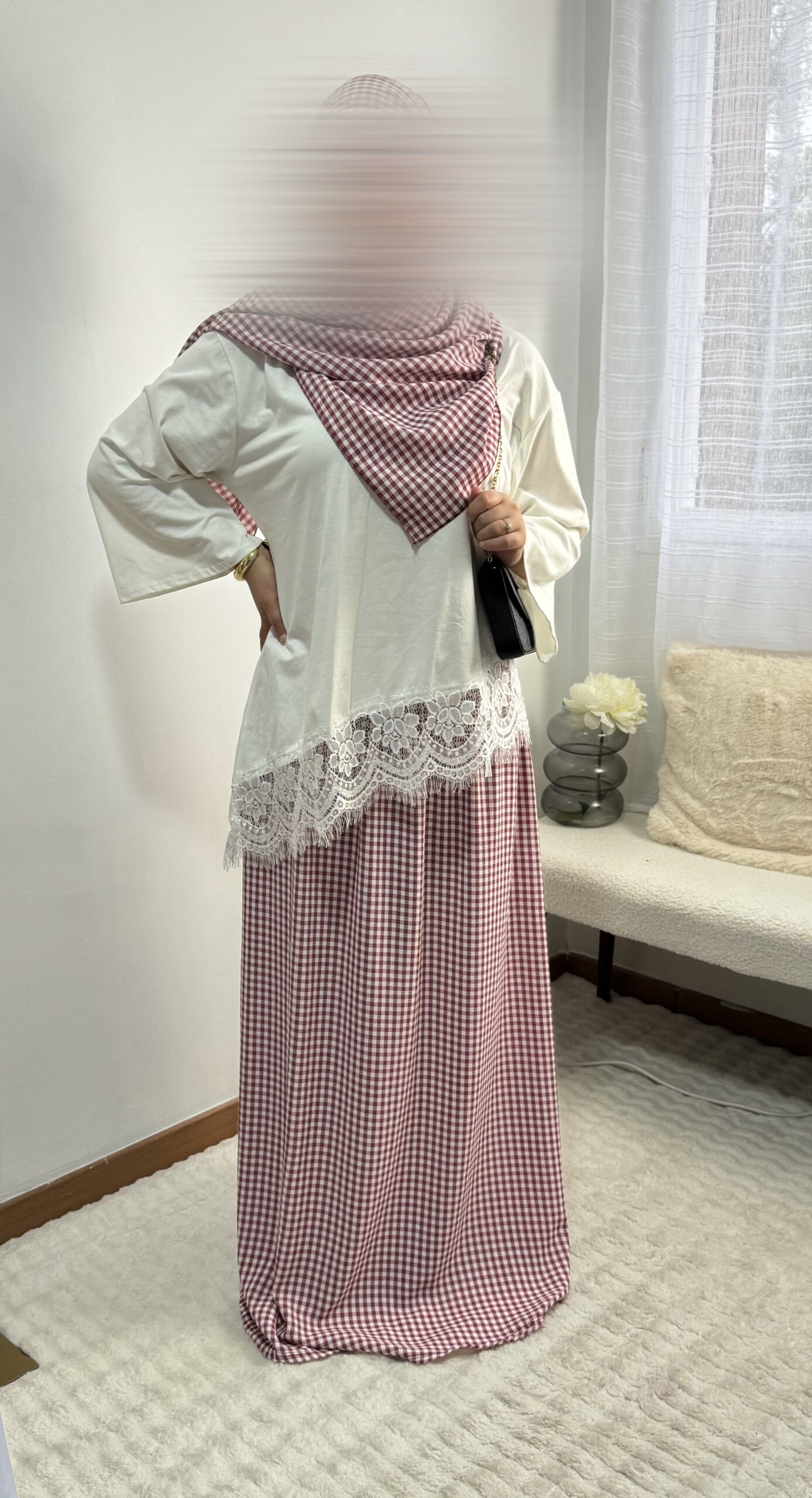 Le haut, délicatement orné de dentelle raffinée, apporte une touche de féminité subtile. La jupe longue fluide au motif vichy crée un mouvement élégant à chaque pas, tandis que le voile carré assorti vient parfaire ce look harmonieux et sophistiqué.