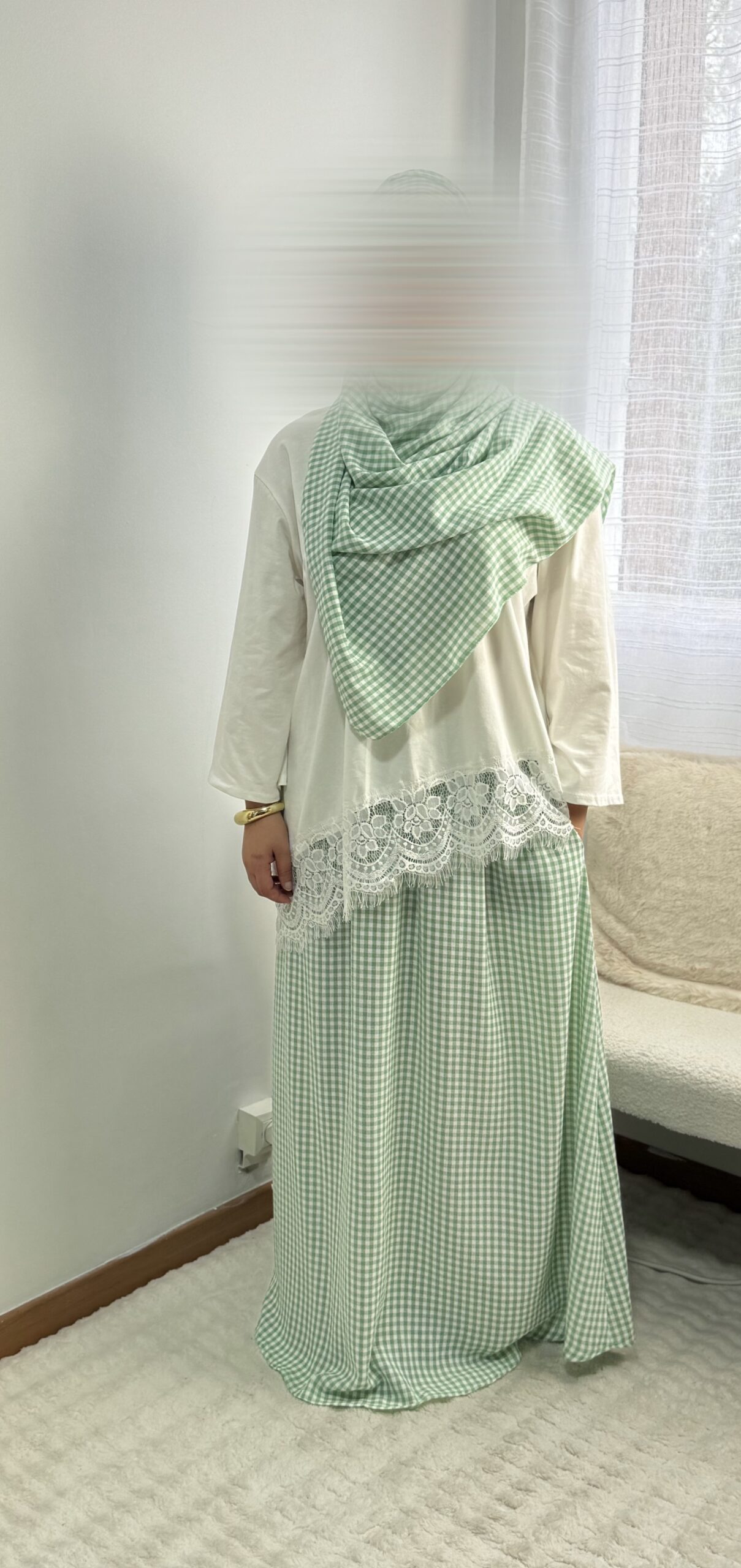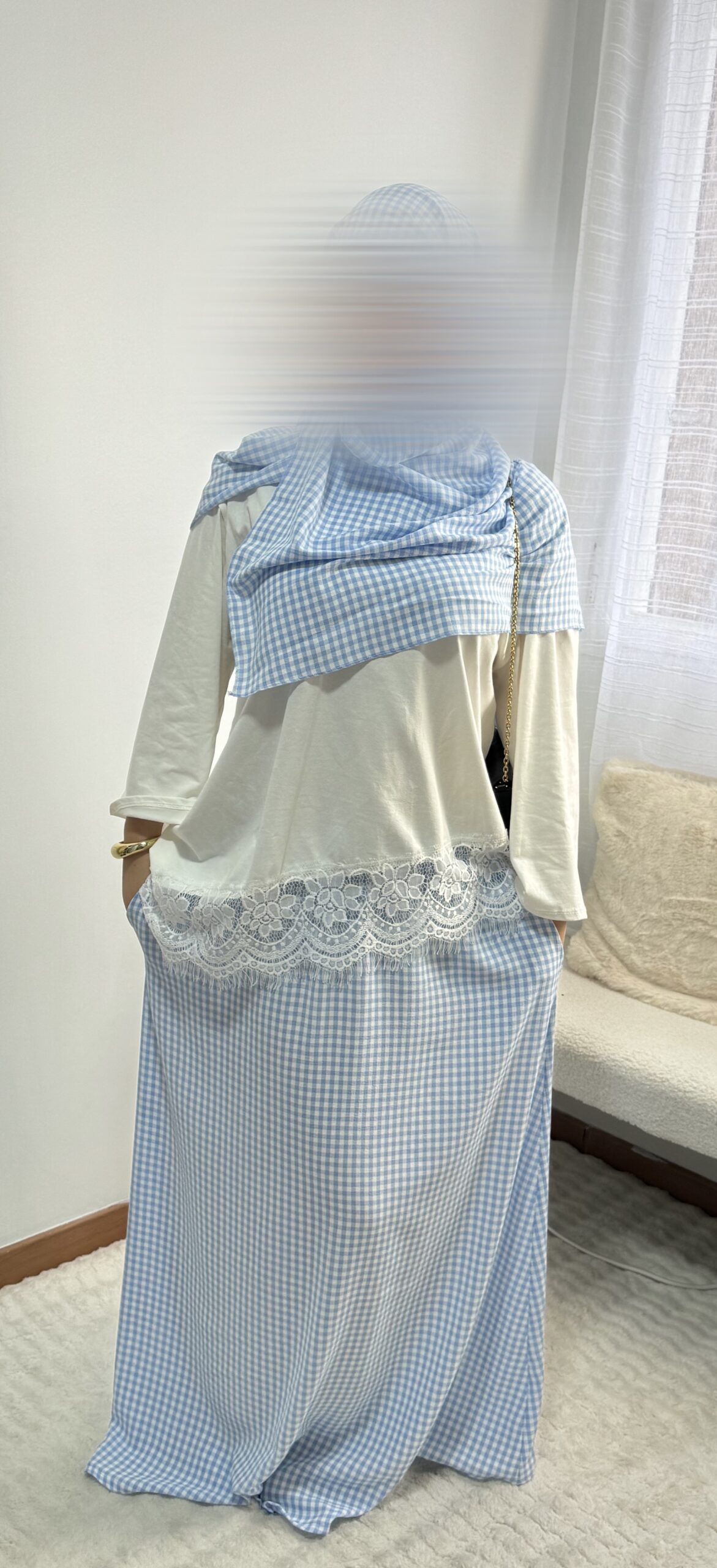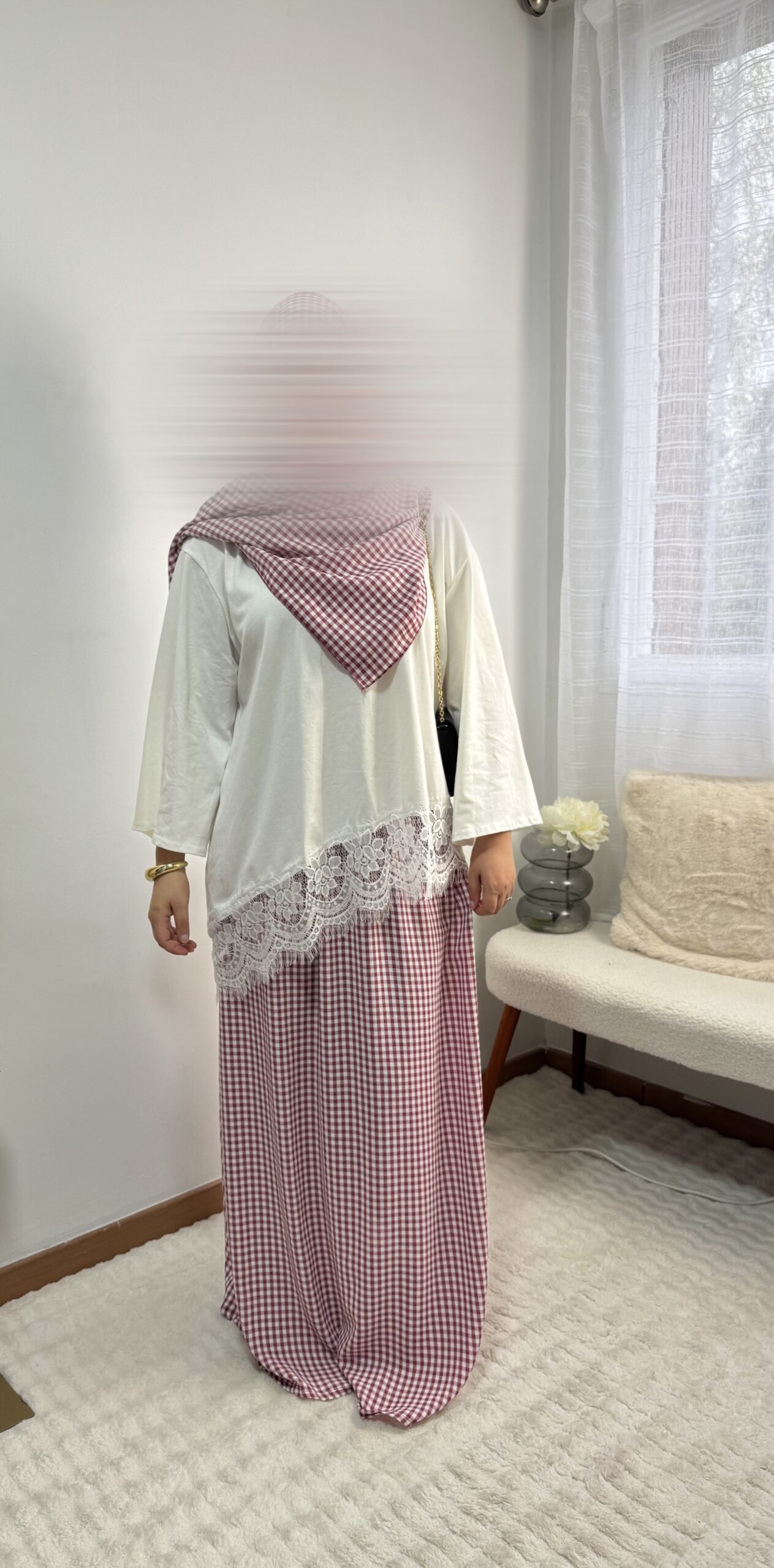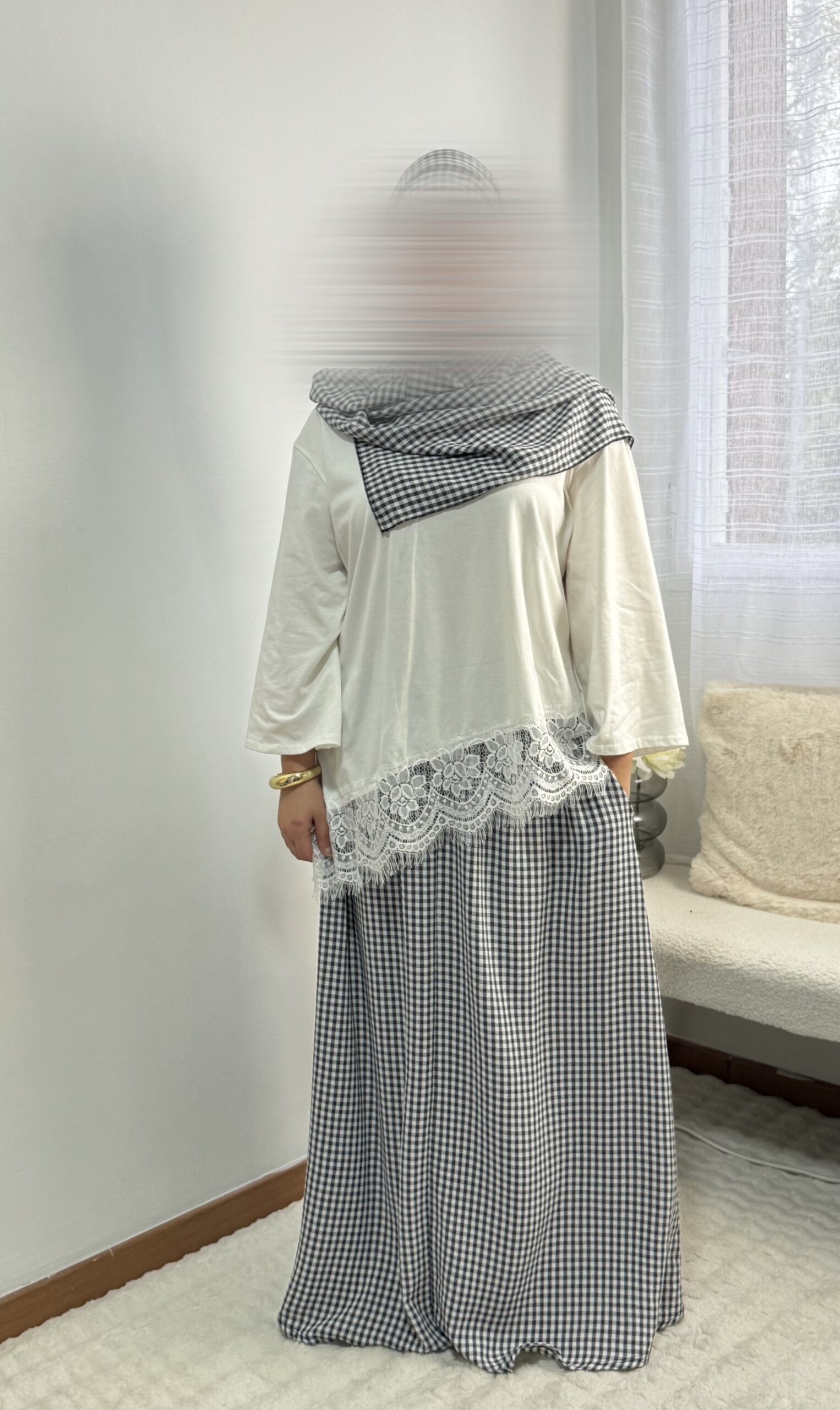 Le haut, délicatement orné de dentelle raffinée, apporte une touche de féminité subtile. La jupe longue fluide au motif vichy crée un mouvement élégant à chaque pas, tandis que le voile carré assorti vient parfaire ce look harmonieux et sophistiqué.
