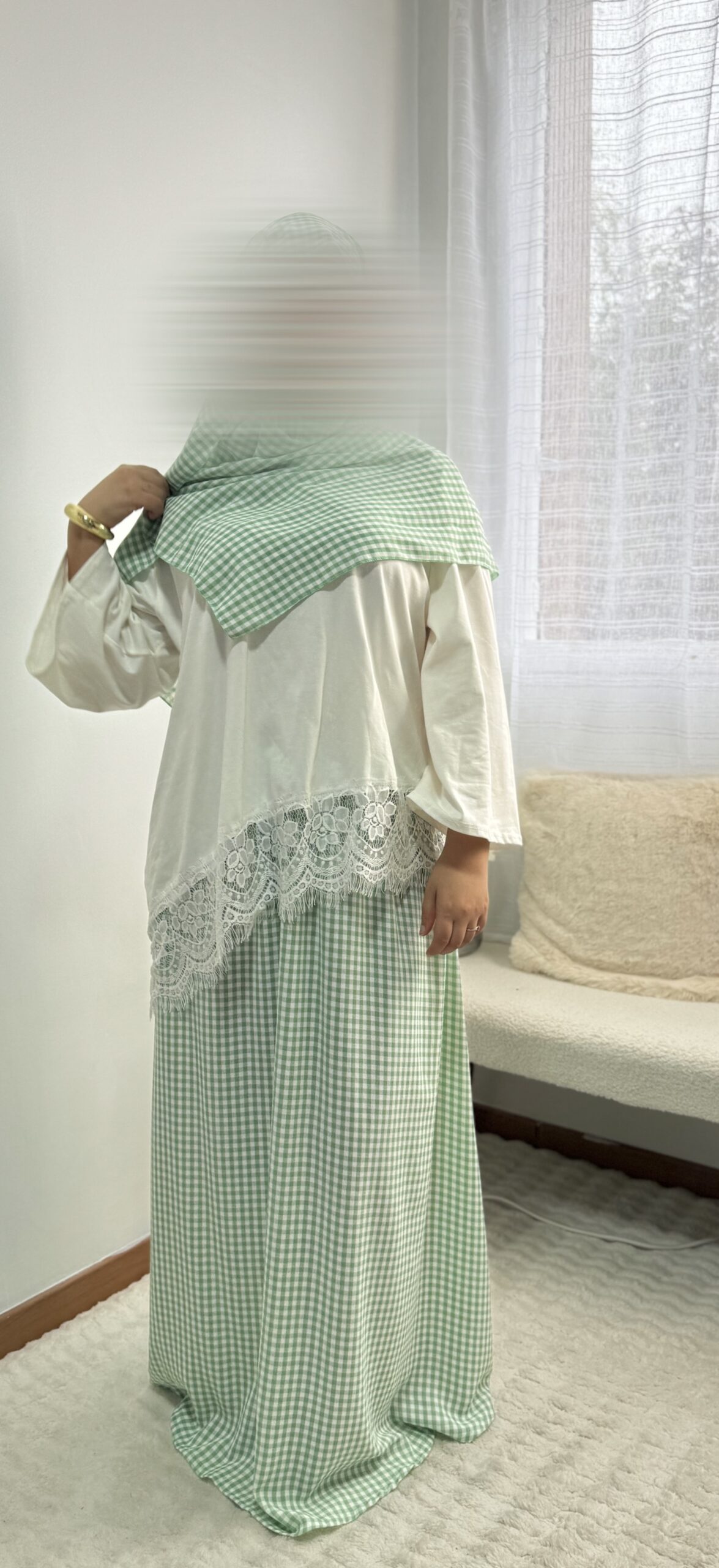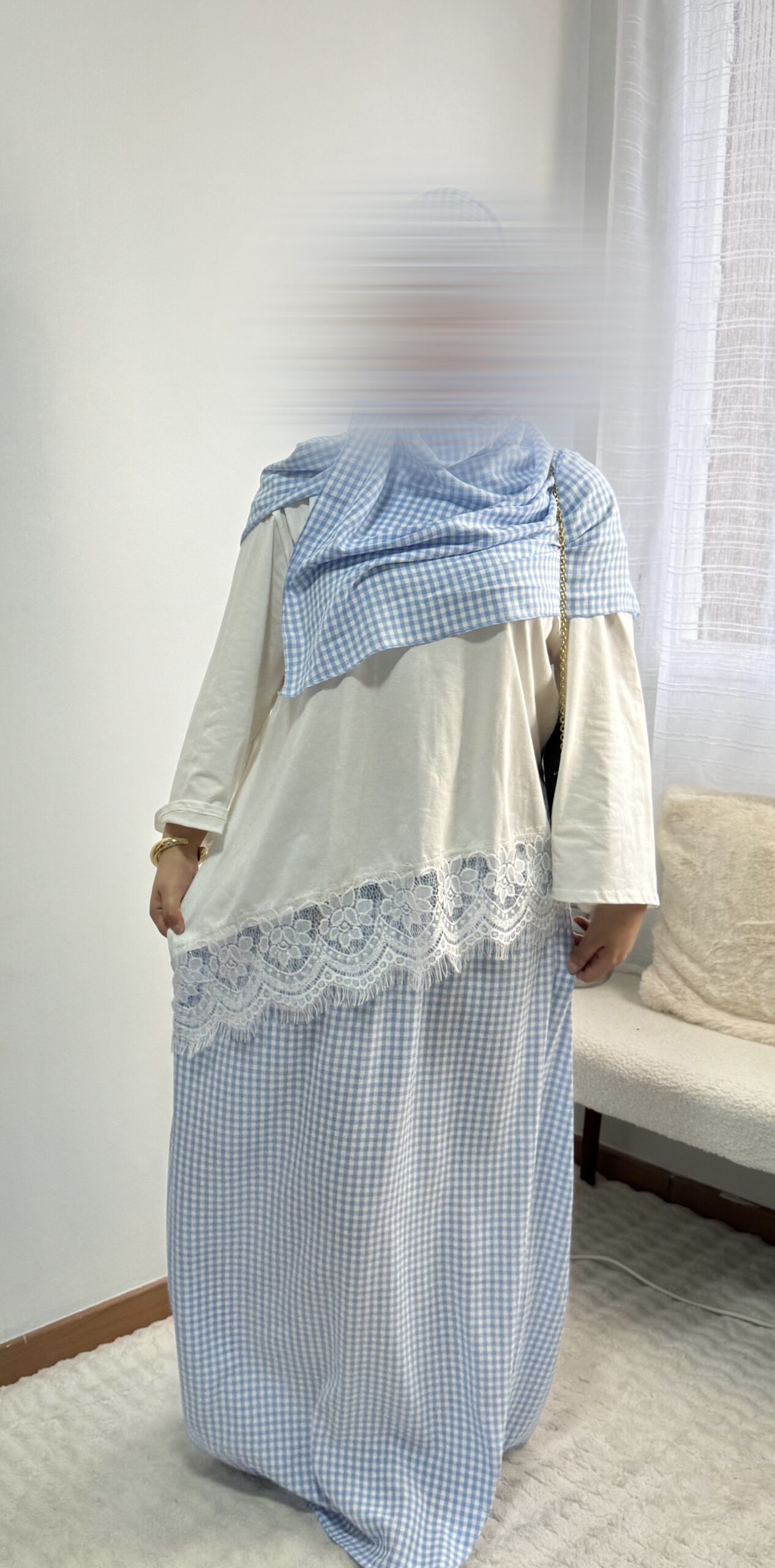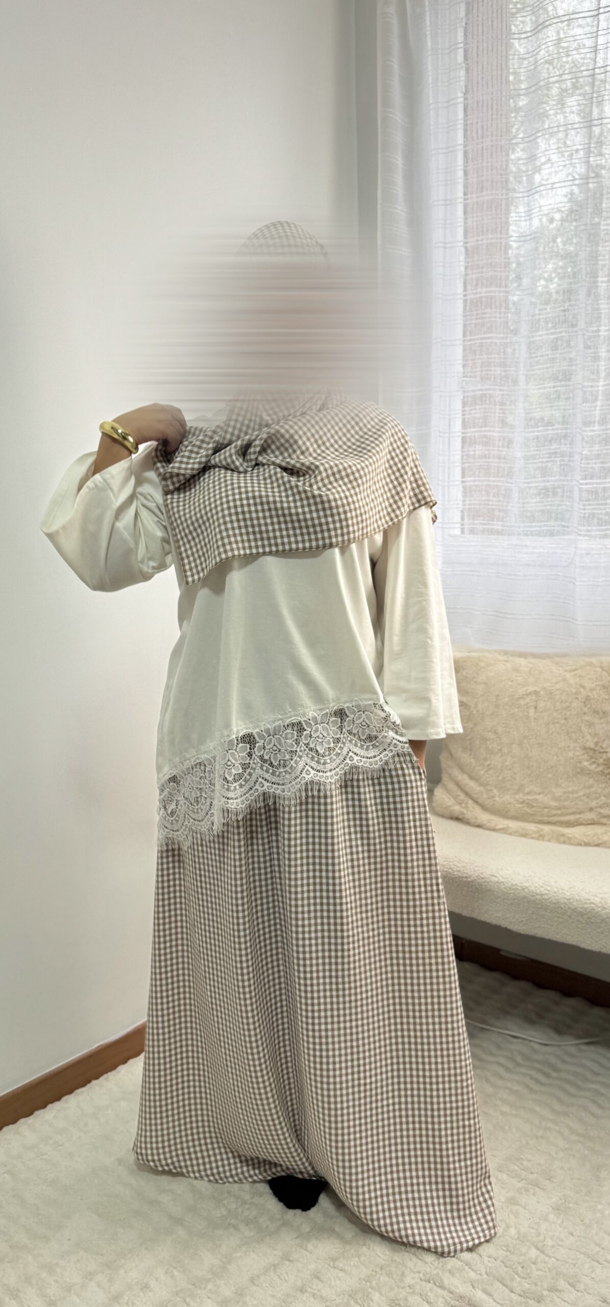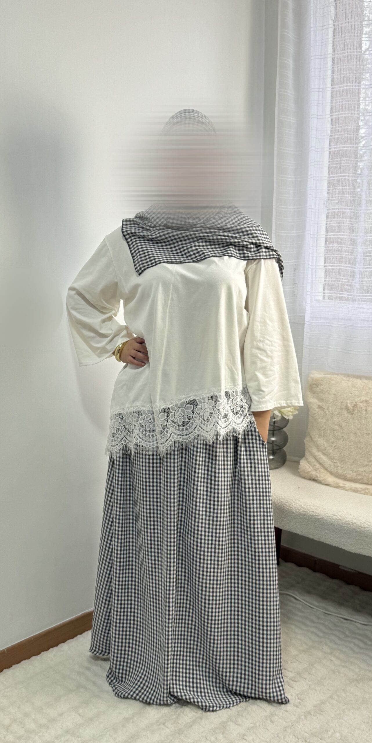 Le haut, délicatement orné de dentelle raffinée, apporte une touche de féminité subtile. La jupe longue fluide au motif vichy crée un mouvement élégant à chaque pas, tandis que le voile carré assorti vient parfaire ce look harmonieux et sophistiqué.