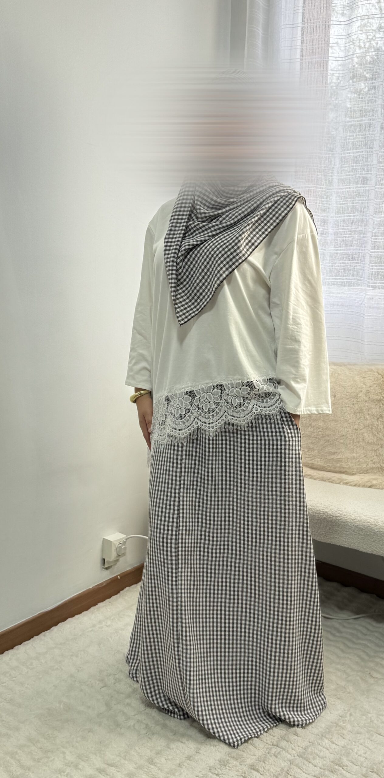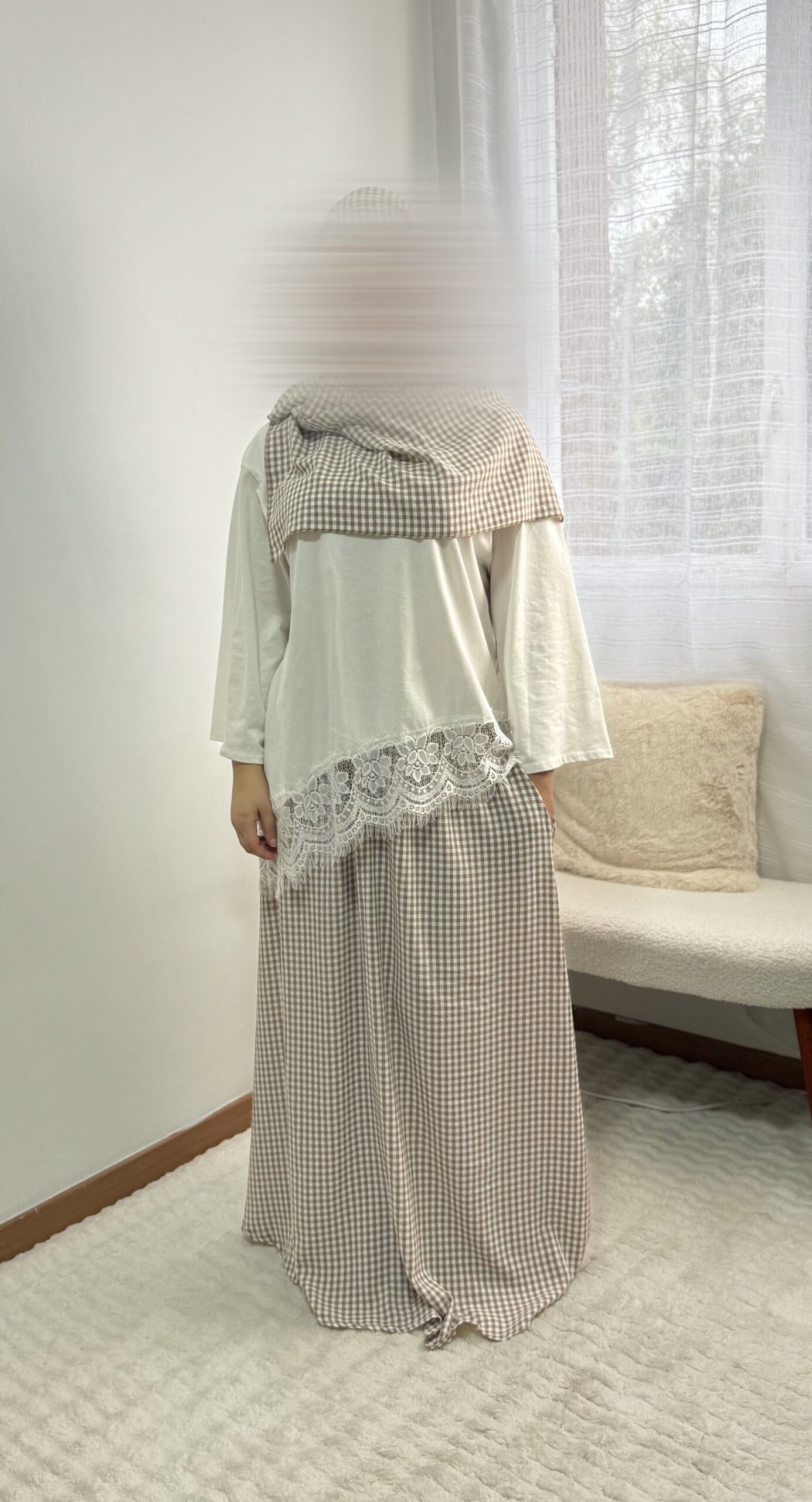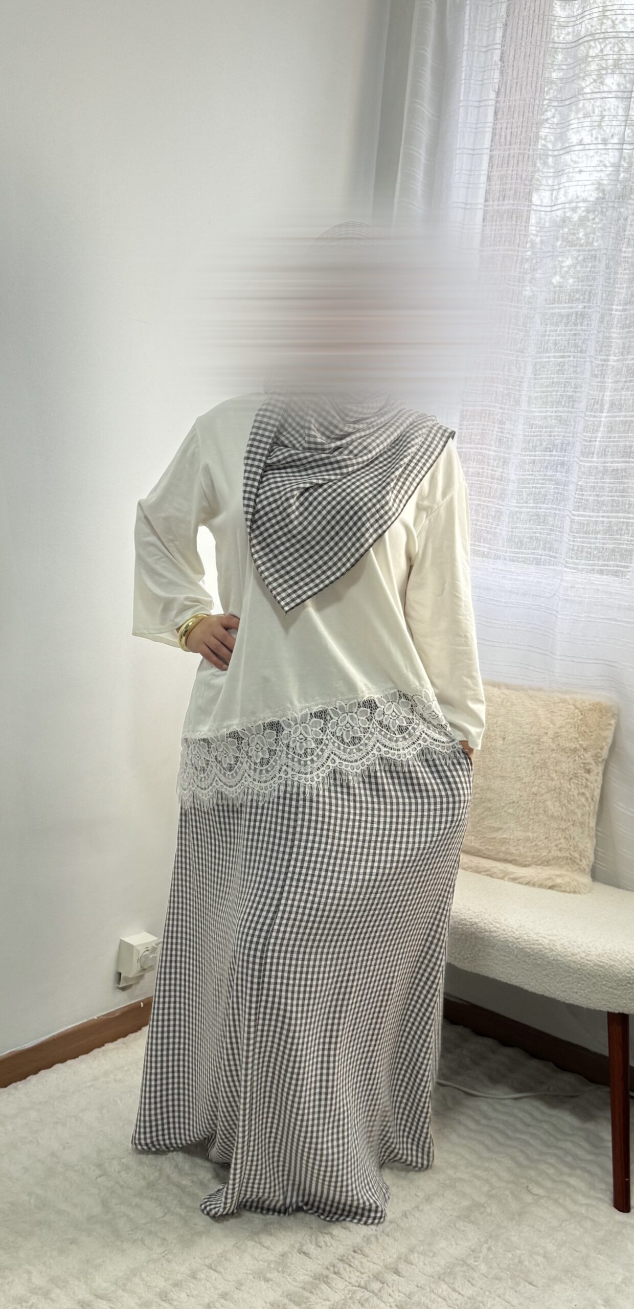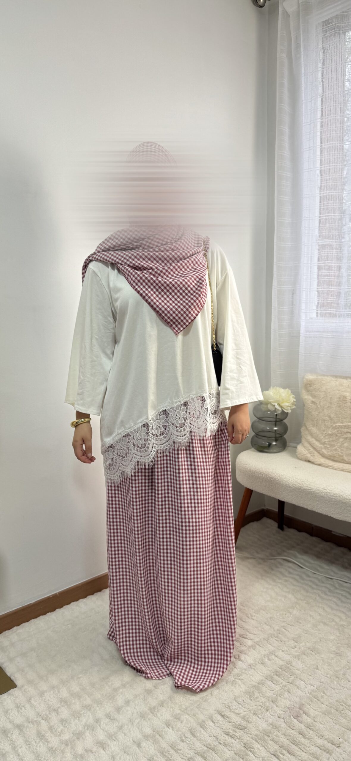 Le haut, délicatement orné de dentelle raffinée, apporte une touche de féminité subtile. La jupe longue fluide au motif vichy crée un mouvement élégant à chaque pas, tandis que le voile carré assorti vient parfaire ce look harmonieux et sophistiqué.