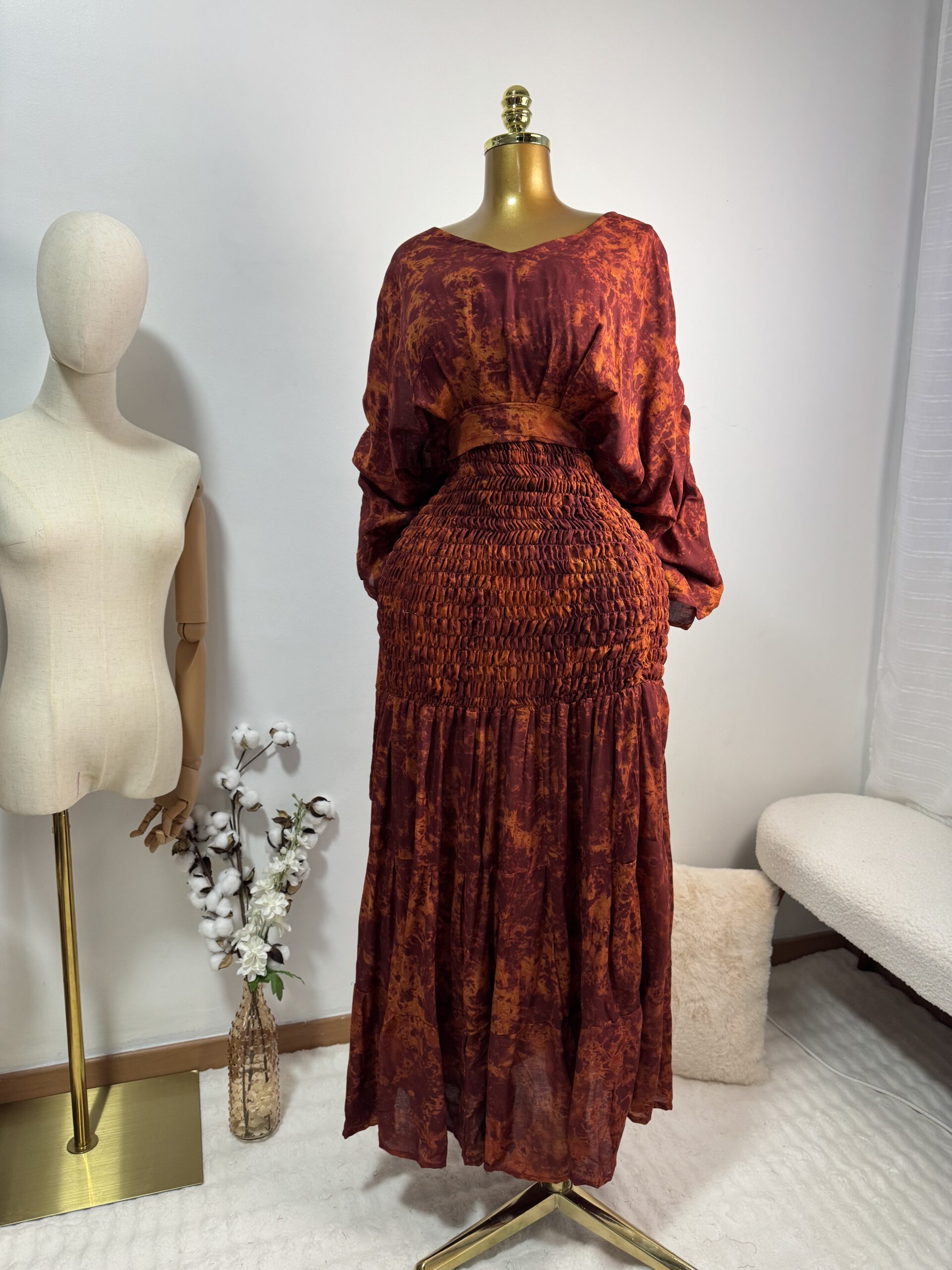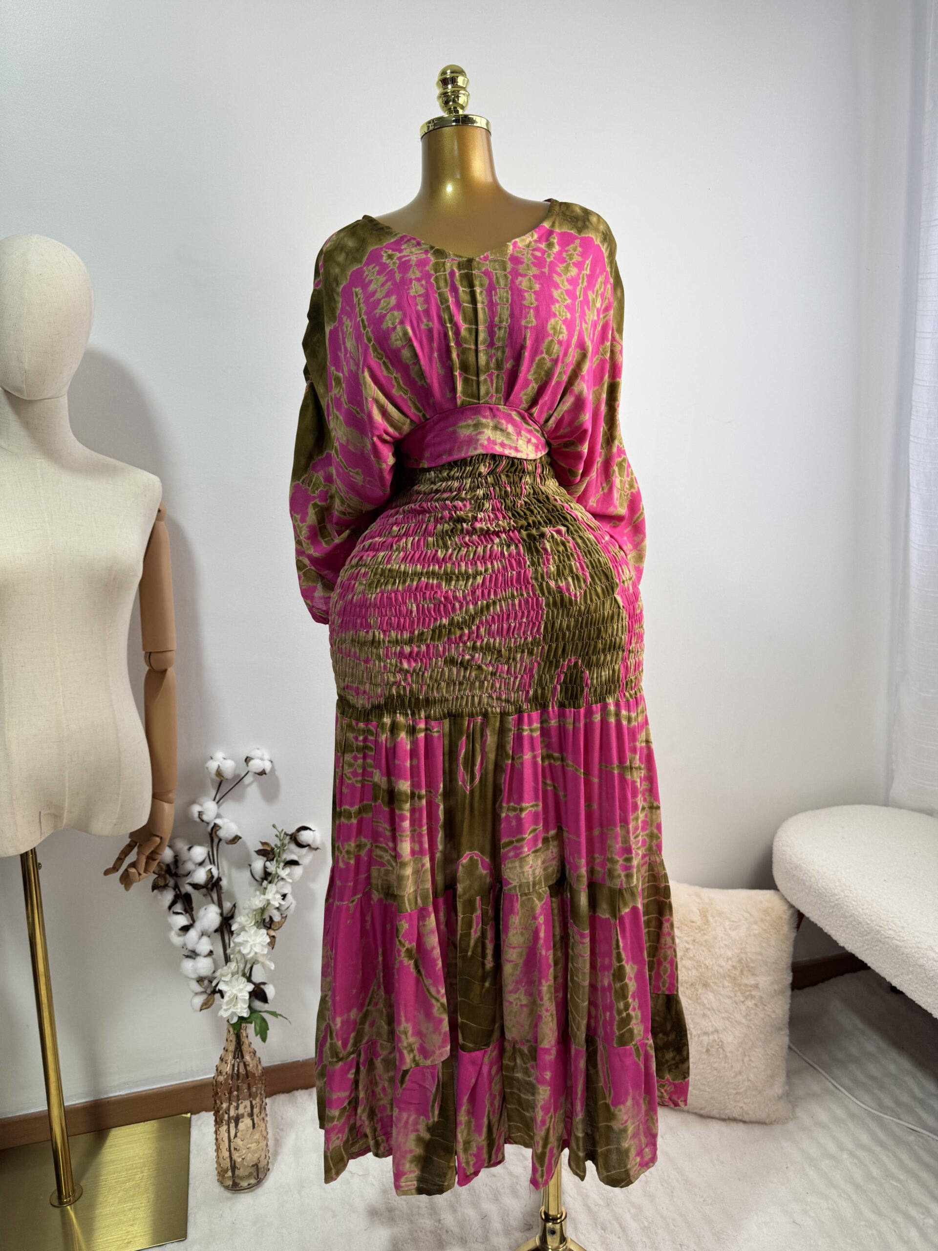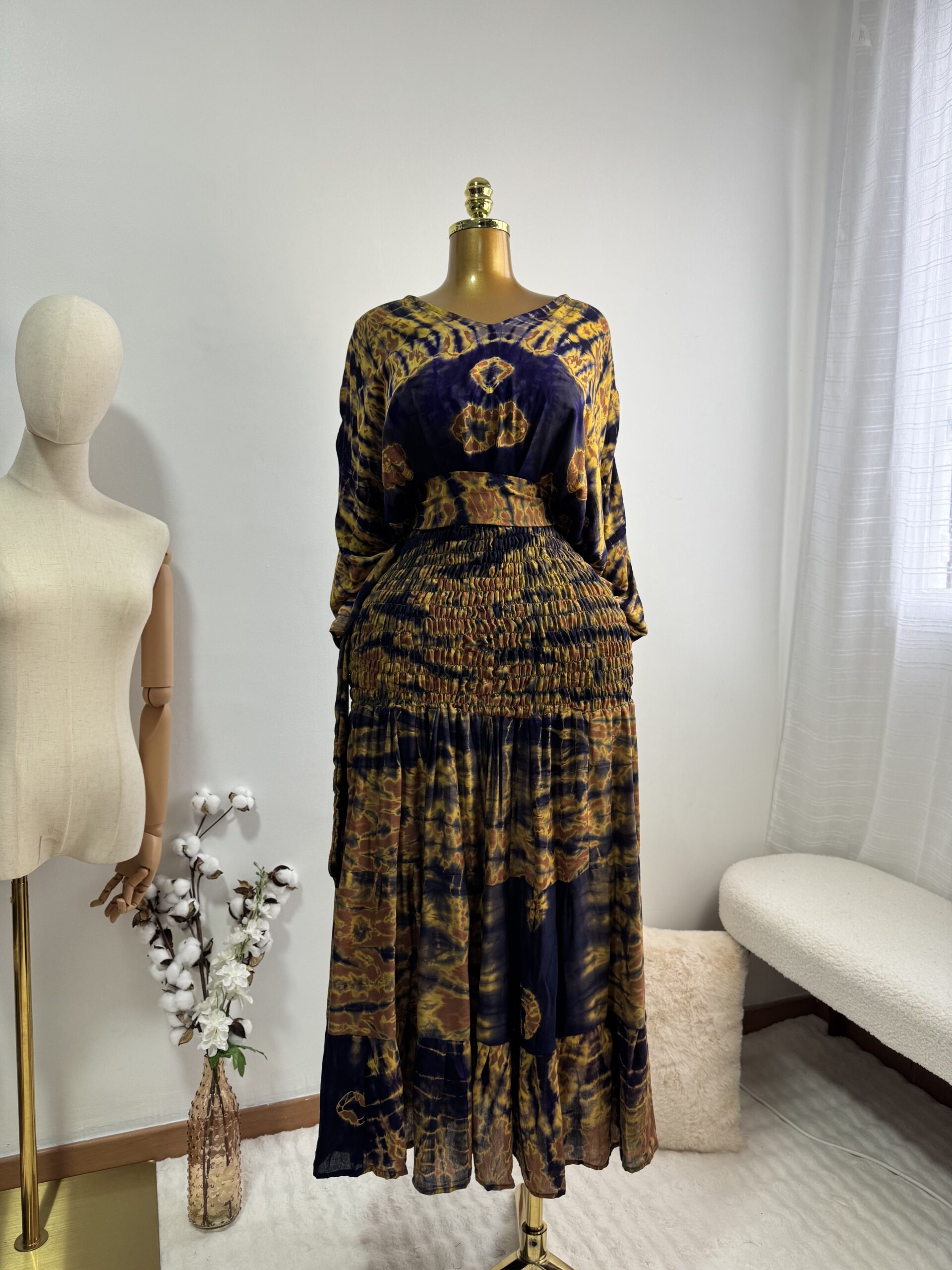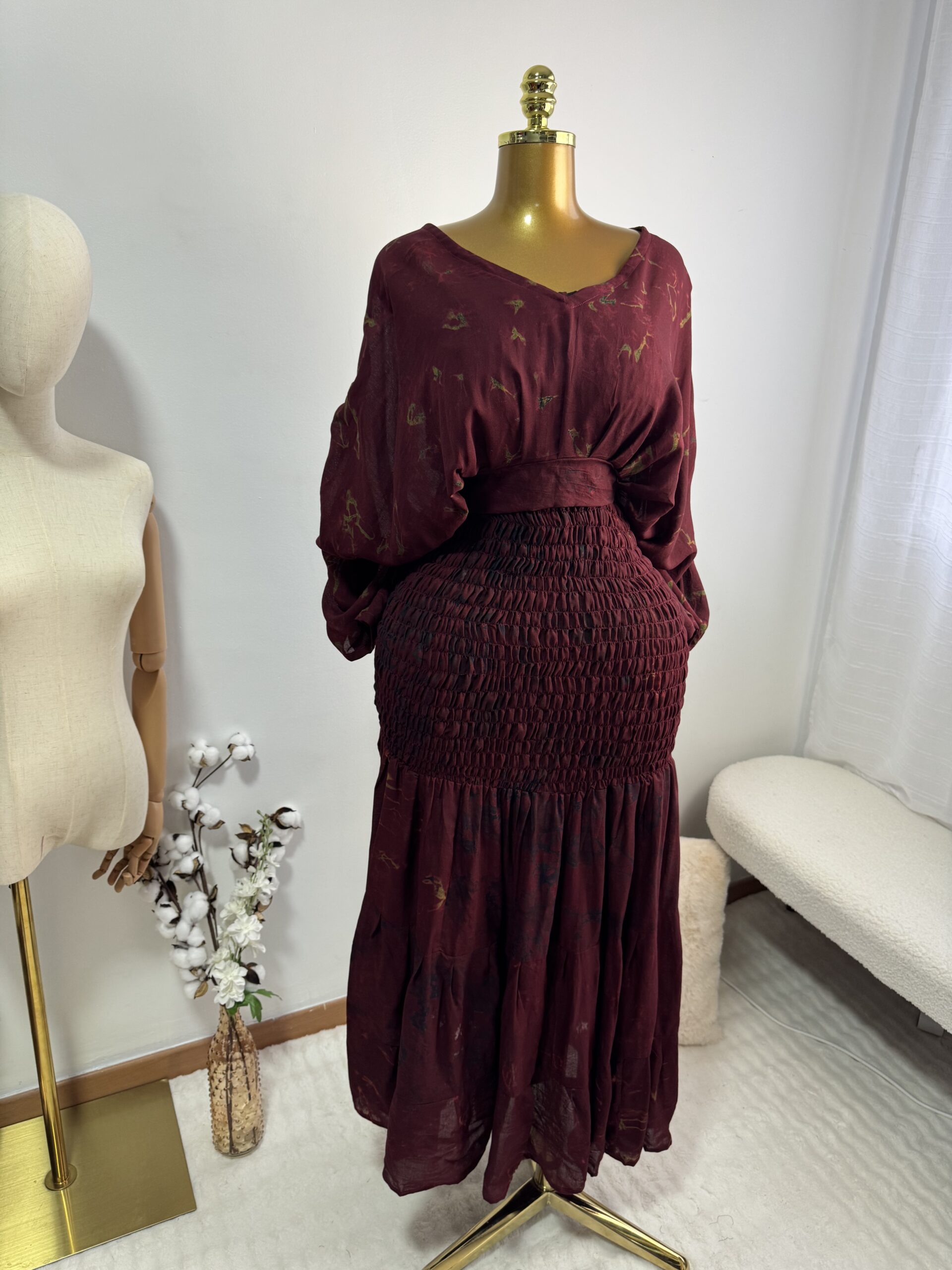 Adoptez le confort avec élégance grâce à cette robe de maison, un incontournable pour vos journées détente. Son haut élastiqué s’ajuste parfaitement à la silhouette avec le bas qui assure assure légèreté et liberté de mouvement. Il y’a un haut qui complète la tenue.